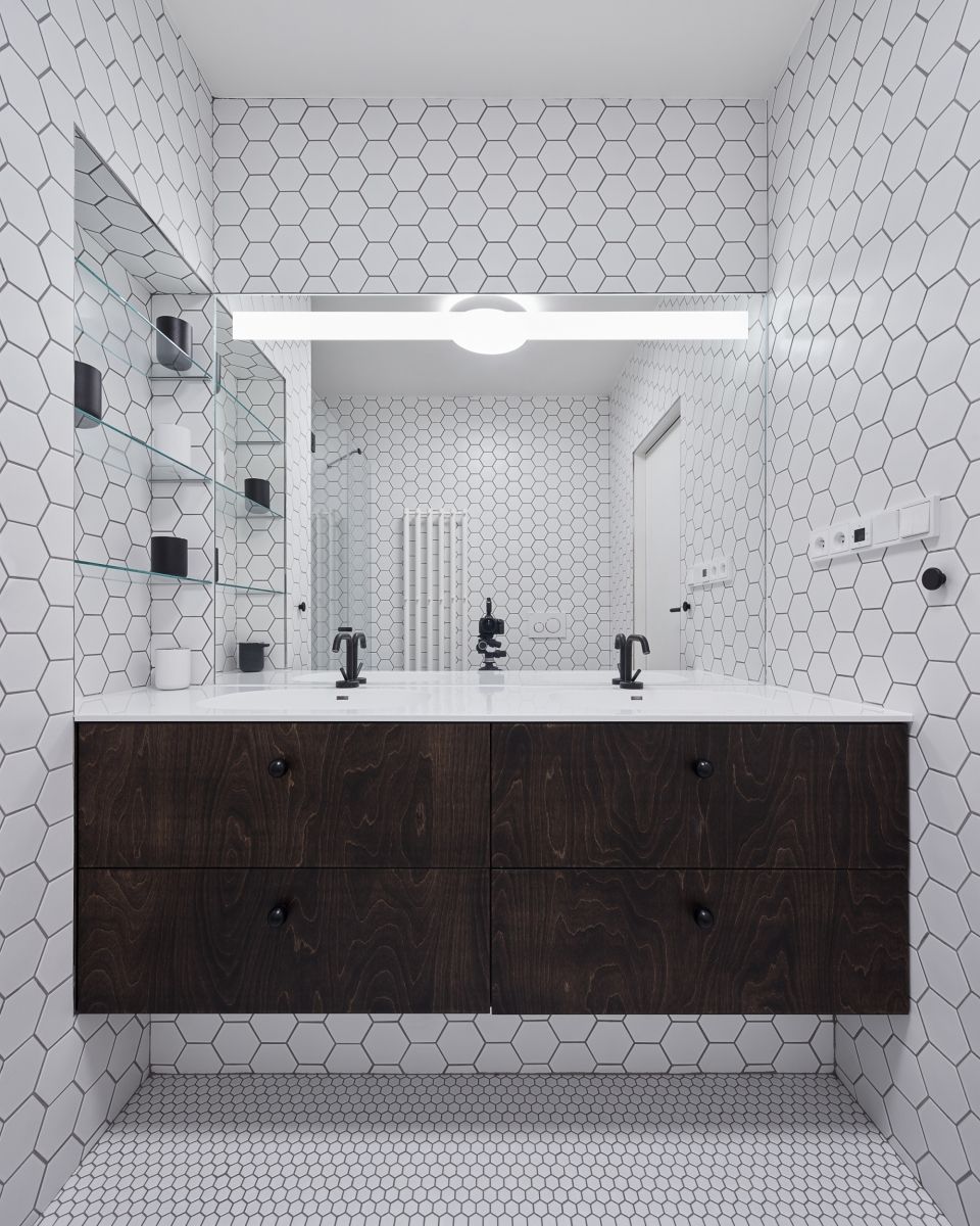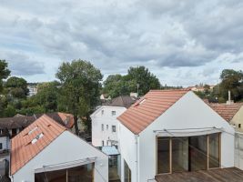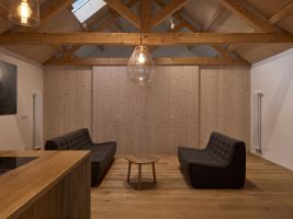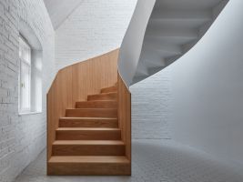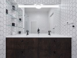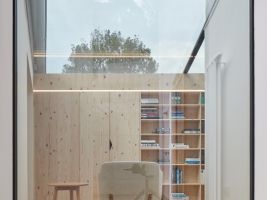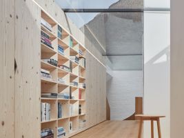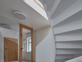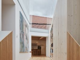 „Pracovní zákoutí s výhledem do ulice lze oddělit posuvnou stěnou z bělené biodesky. Smrková biodeska se dále propisuje interiérem v dřevěné stěně s knihovnou a především o patro výše v dětských pokojích s vlastní půdičkou na hraní. Obklady a dlažby navrhujeme jednotně hexagonálního tvaru,“ dodávají autoři z Atelier 111 architekti