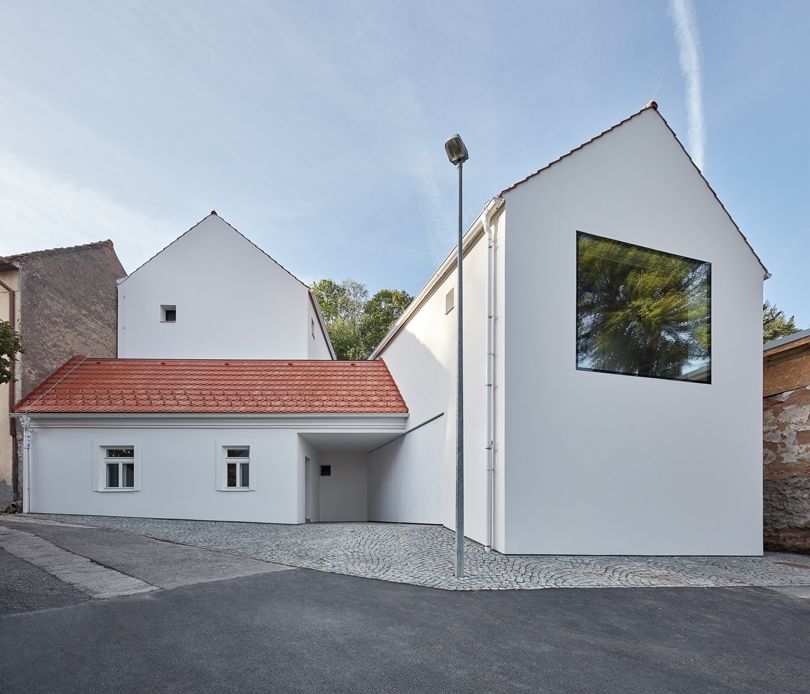 „Dům sestává ze třech samostatných, ovšem vzájemně propojených, objektů, které se svým tvarem i materiálovým řešením přizpůsobují okolní zástavbě. Díky promyšlenému zasazení domu do svahu získaly všechny obytné prostory včetně dětských pokojů v podkroví přímý vstup na zahradu. Štítové stěně dominuje velké fixní okno v líci fasády, za kterým se nachází malá pracovna a otevřený prostor kuchyně, jídelny a obýváku,“ popisují autoři projektu na webu earch.cz.