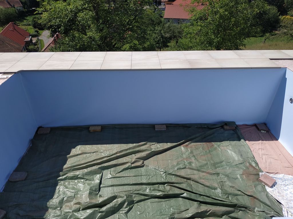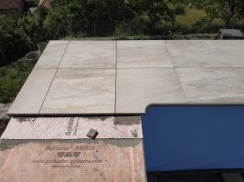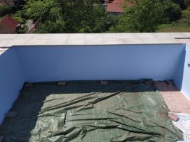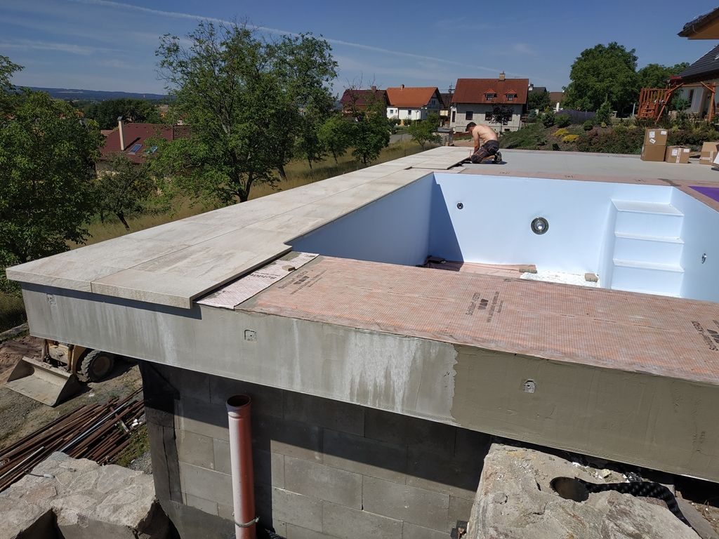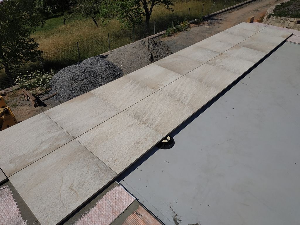 Vedle kvality exteriérových povrchů hraje roli také jejich správná pokládka. Pro okolí bazénu na obrázku, byla použita dvoucentimetrová dlažba Stone D od italského výrobce Impronta s protiskluzným povrchem. Celá terasa je pokládána na stavitelné terče tak, aby okolí bazénu bylo vodorovné, ale voda mohla pohodlně odtékat pod dlaždicemi.
