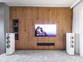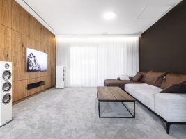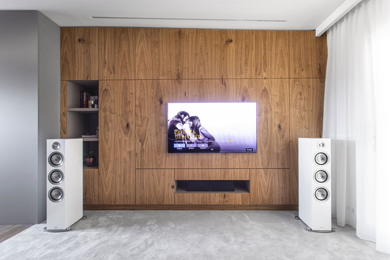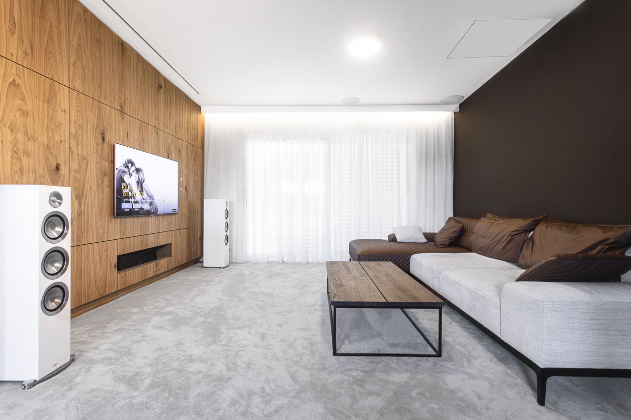 „Plátno i projektor se dají skrýt do vestavěných podhledů a díky ovládání vám pak budou jednotlivé komponenty vyjíždět. Místo se dá najít i pro reproduktory, které budou v místnosti působit esteticky. Vždy se radíme jak s klientem, tak s designéry,“ říká Miroslav Mlčůch ze společnosti VOIX.