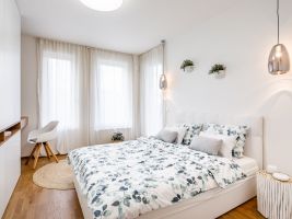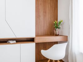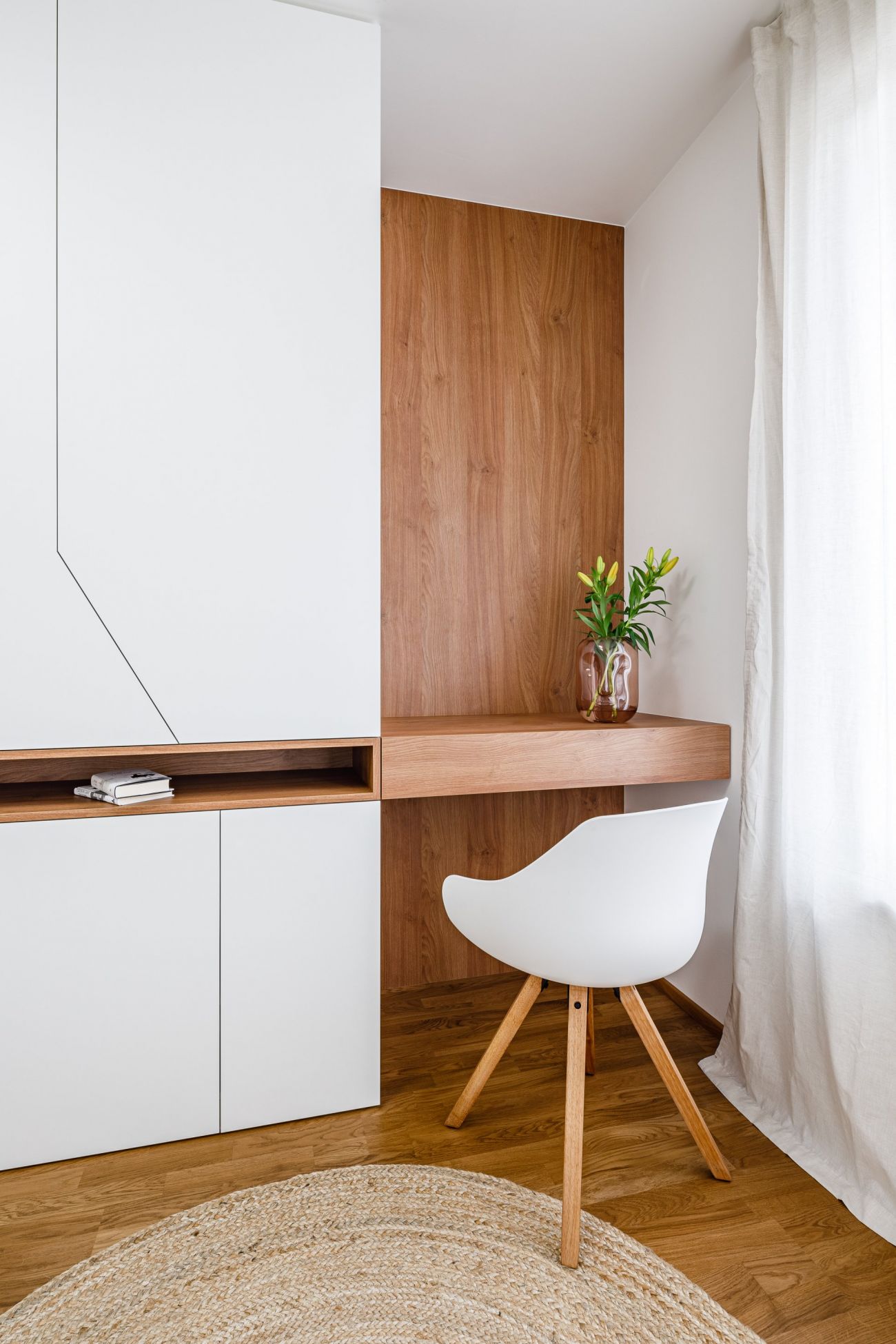 Součástí obývacího pokoje je kuchyňský kout s elegantní černou pracovní deskou, kterou doplňuje keramický obklad v bíločerném dekoru. Jídelní stůl ve stejném barevném odstínu jako zbylý nábytek tvoří přechodový prvek mezi prostorem pro vaření a tím obytným. „Jako zajímavý prvek centrální části bytu jsem zvolila nevšedně ztvárněnou stěnu s diagonálními policemi plynule navazující na kuchyňskou linku. Na policovou stěnu jsem vybrala drobné dekorační předměty v dřevěném provedení,“ popisuje Lenka Hlaváčková Schubertová a dodává: „Zároveň jsem se snažila do interiéru vnést přírodní motivy, které krásně zapadají do finského stylu. Proto se právě dřevo se stalo dominantním prvkem všech místností. Navíc jsem po celém bytě umístila závěsné nádoby na květiny a povlečení na manželské posteli v tlumených tónech zdobí modrozelené lístky.“ Se zbytkem vybavení bytu ladí rovněž moderní osvětlovací tělesa. V ložnici se dokonce podařilo designérce zakomponovat útulný pracovní koutek.