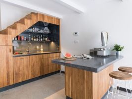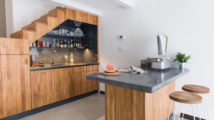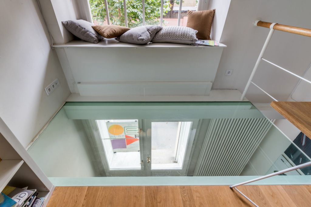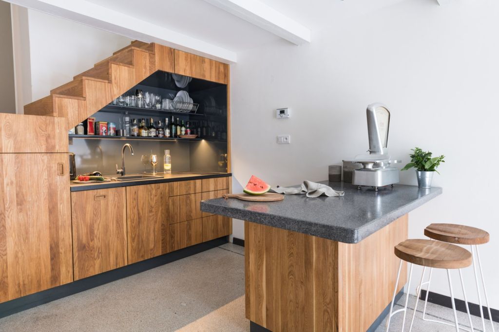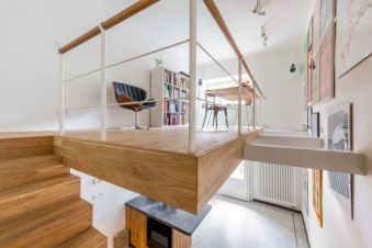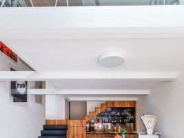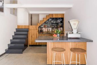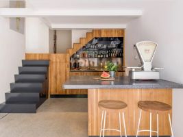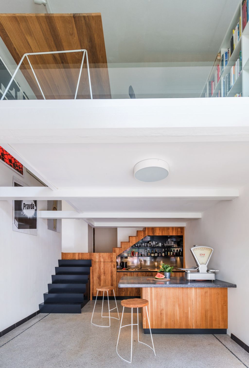 „Jedná se o několikaúrovňový prostor přístupný přímo z ulice. Jedním z hlavních cílů bylo vytvořit z netradičního prostoru s výlohou do ulice kuchyni s jídelním koutem. Zde jsme si vyhráli s tradiční typologií obchodu, takže v kuchyni je ostrůvek evokující prodejní pult,“ říká Pavel Lejdar.