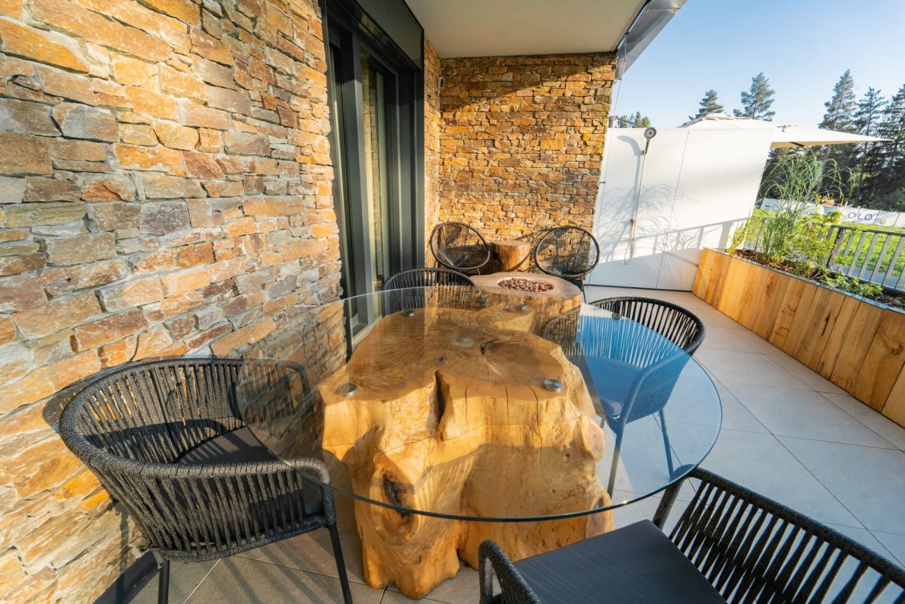 Zahradní nábytek, konkrétně pletené židle Kave Home Yanet z kombinace kovové podnože a látky, zvolil jako designový doplněk pro svou terasu v Molo Lipno apartmánu moderátor Míra Hejda ze sortimentu společnosti Designový nábytek. Židle skvěle doplnily unikátní stůl vytvořený z kmene topolu. Terasu navíc doplnil o dvě lehátka určená pro relax.