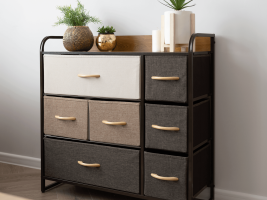 Nemáte-li jinou možnost nebo vám to více vyhovuje, můžete ukládat převážnou část oblečení do velké komody se zásuvkami. Toto řešení je ovšem vhodné spíše pro ty, co často nosí trička nebo sportovní oblečení, které se nemačká. Komoda je vhodná také na spodní prádlo, pyžama a funkční prádlo. Ideální je šuplíky vybavit organizéry. Oblečení sem pak můžete umisťovat například dle osvědčené metody KonMari. Celý systém je založen na ukládaní věcí dle druhu do různých boxů a vytváření podkategorií, abyste váš oblíbený kousek snáze našli. Metoda je založena i na atypickém skládání věcí. Oblečení se ukládá nastojato jako knihy v knihovně. Cílem je, aby jednotlivé kusy byly vidět na první pohled.