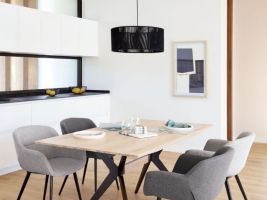 Jídelní kout je pak vhodné osvětlit závěsným světlem, které dokáže navodit příjemnou atmosféru. Minimální výška pro zavěšení světla je 60 cm nad stolem. Toto osvětlení by mělo mít také alespoň z zčásti krytou žárovku, aby nedocházelo k oslnění.
