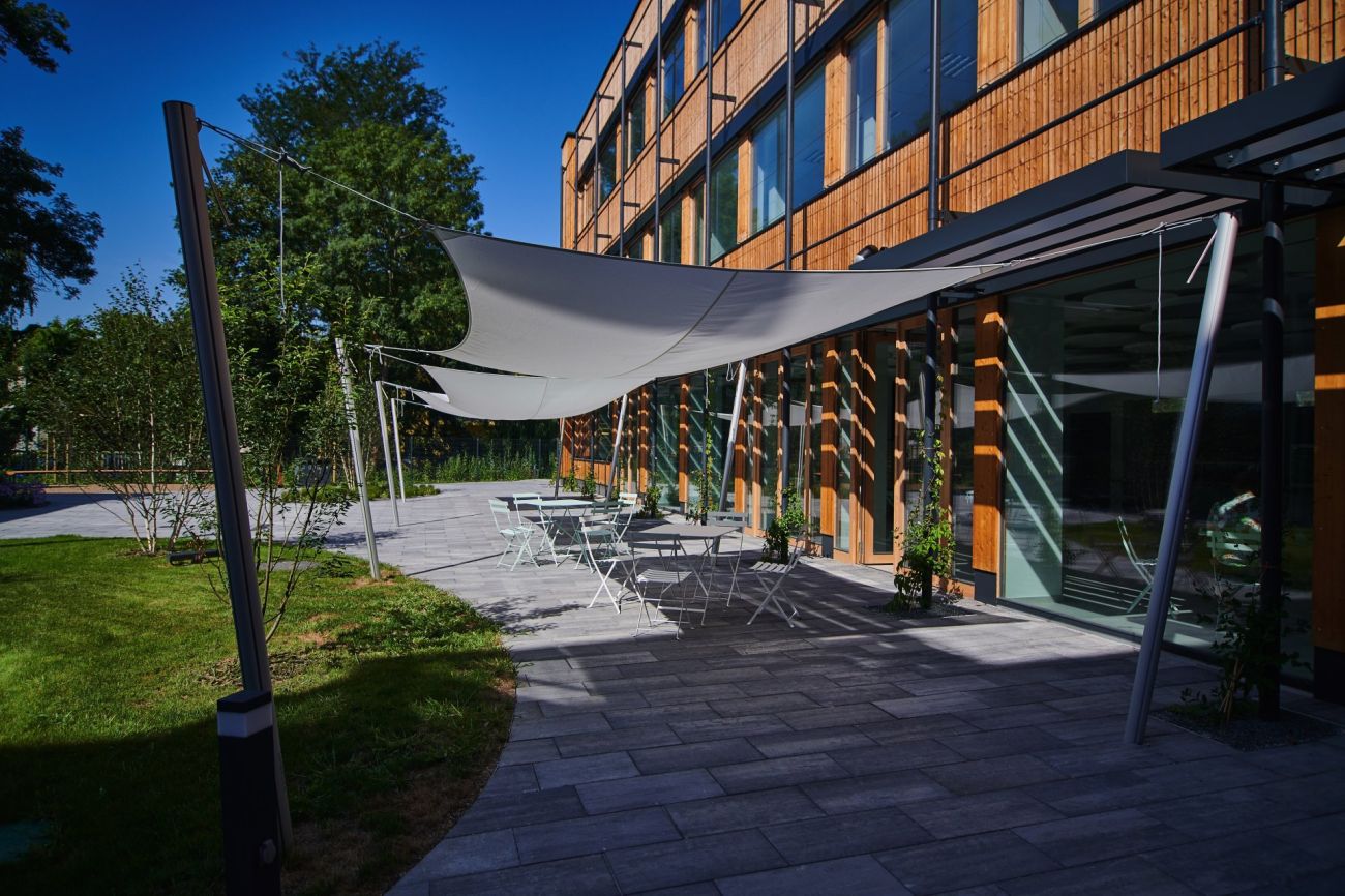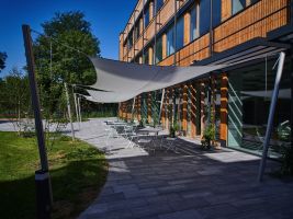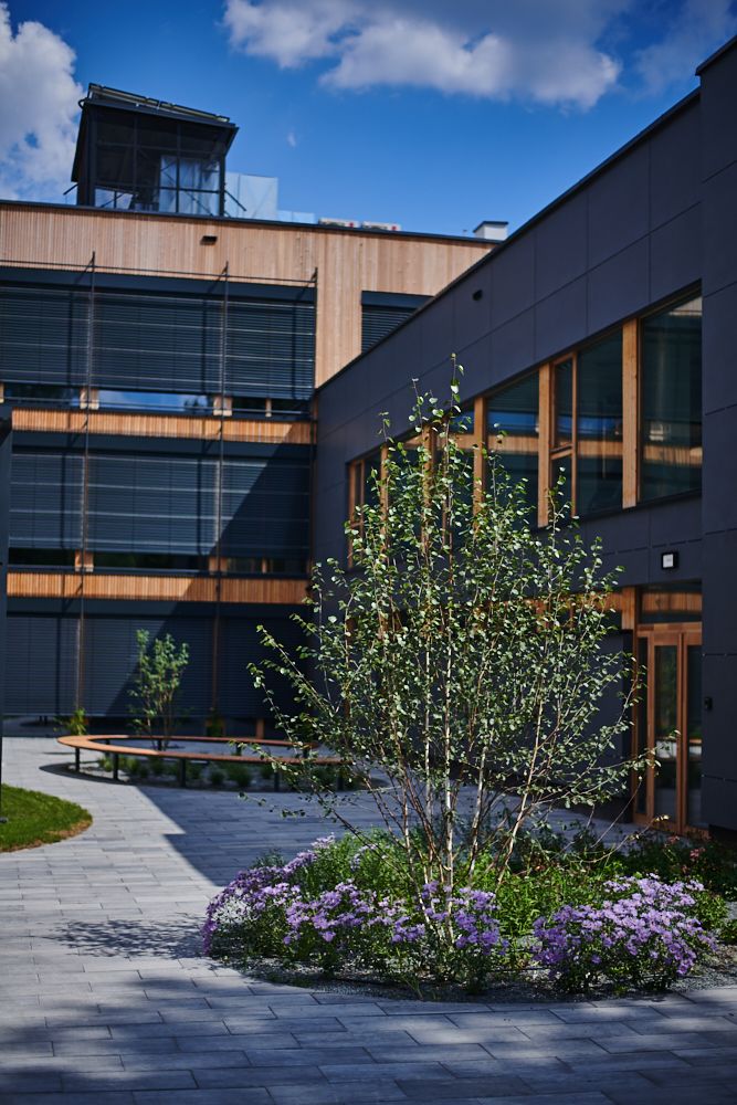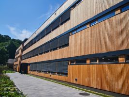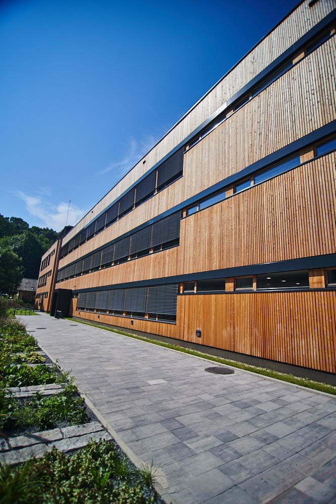 Hlavním cílem projektu bylo přestavět původní budovu na chytrou, bezpečnou a trvale udržitelnou. Inovativní je především dřevěná zavěšená fasáda ENVILOP, která uspoří 30% primární energie. Větší plochy fasád jsou tvořeny dřevěnou laťovou fasádou z neupraveného sibiřského modřínu. Ostatní plochy jsou pak opatřeny cembonitovým obkladem.