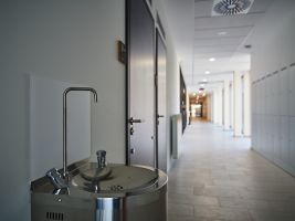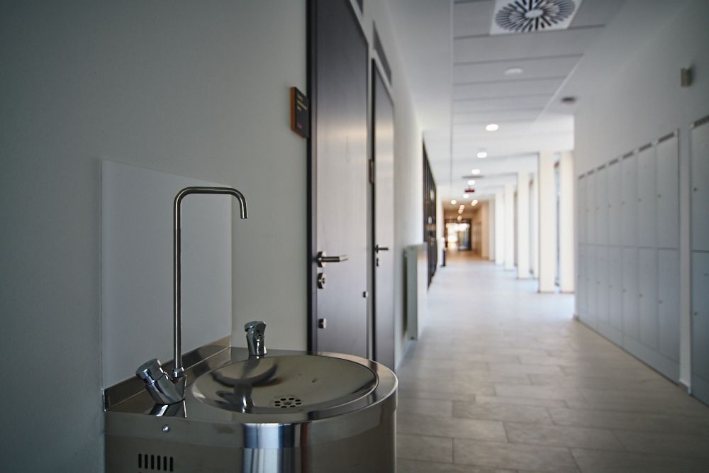 Umístěny zde byly také akumulační a retenční nádrže. Tyto prvky pomáhají zadržovat dešťovou vodu v lokalitě, stíní budovu a brání jejímu přehřívání. Akumulovaná dešťová voda se využívá k zálivce zeleně, čímž dochází k úspoře pitné vody. V případě nedostatku se nádrž doplňuje ze studny. V rámci odpovědného hospodaření s vodou je šedá voda ze sprch a umyvadel přečištěna a využita na splachování WC v budově, což ušetří 19 % celkové spotřeby pitné vody ve škole.