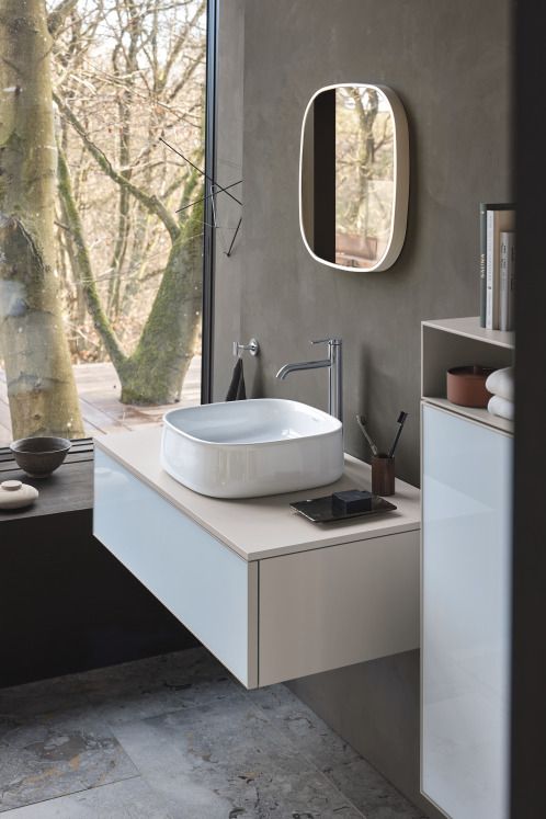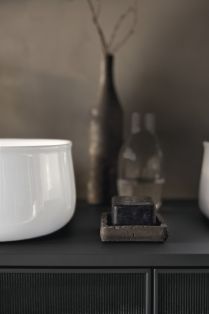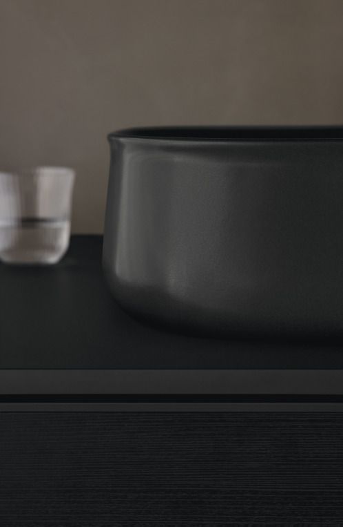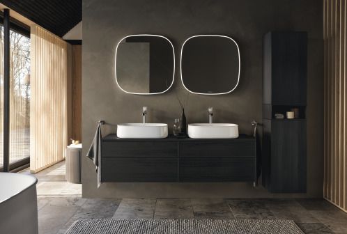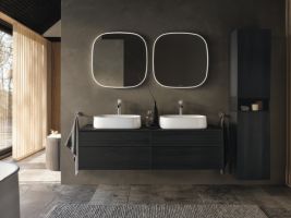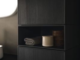 Nábytek je vyroben z přírodních materiálů, jako je dřevo a strukturované sklo a nabízí nejen dostatek úložného prostoru, ale je také mimořádně příjemný na dotek. Navržen je modulárním způsobem a lze jej rozmístit různými způsoby, například jako otevřené police nebo zásuvky s technologií push-open a se samozavíráním. Korpus a rám nábytku mají snadno čistitelný povrch s efektem proti otiskům prstů a jsou dostupné v několika jemných barvách. Čela skříněk dodávají hravý prvek a jsou nabízena v různých variantách. Zatímco možnosti v přírodním dubu a černém dubu vytvářejí teplý a hmatový efekt, bílé tabulové sklo a černé texturované sklo vnáší do koupelny eleganci. Povrchy a hrany nábytku jsou pečlivě utěsněny, aby byly voděodolné.