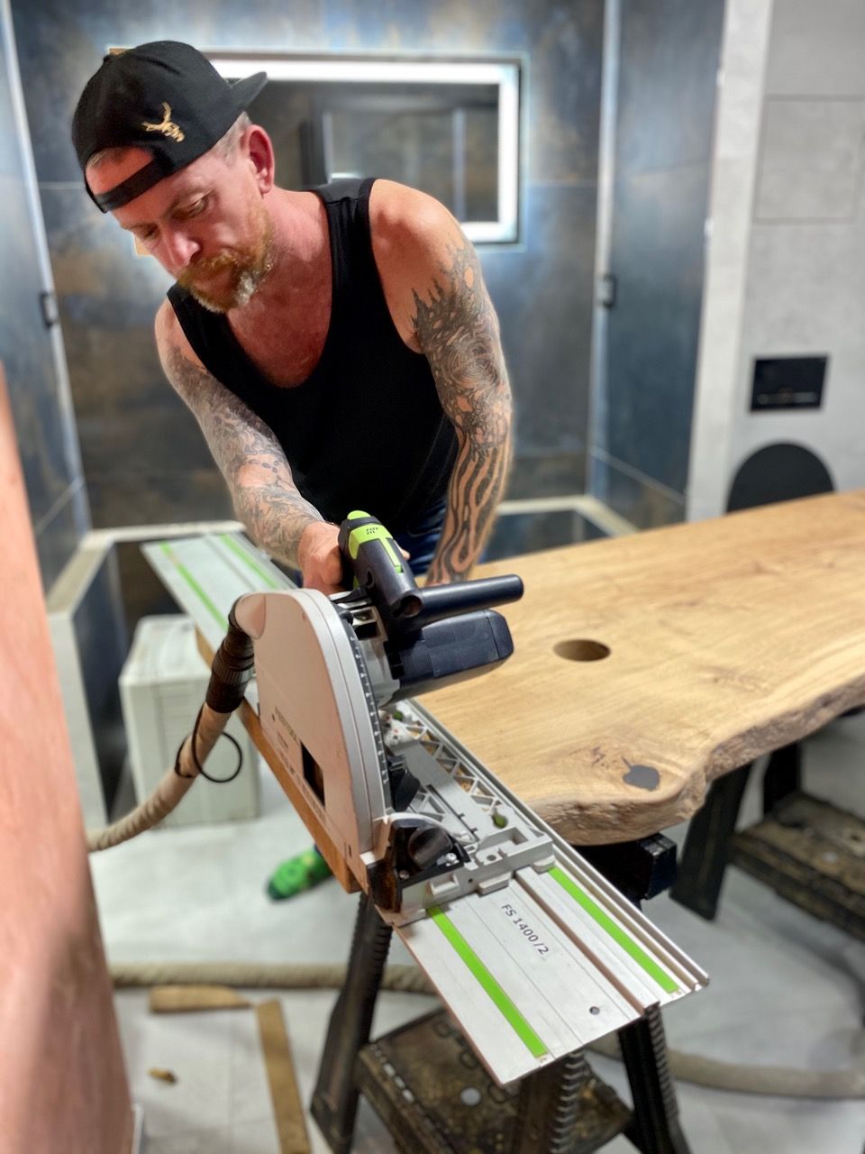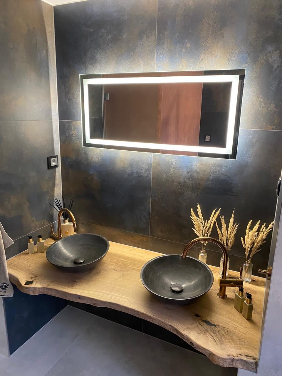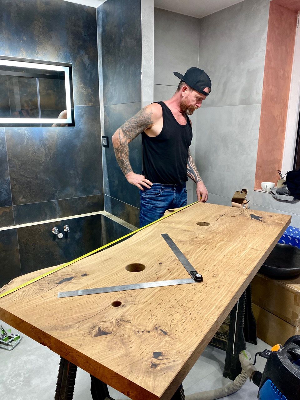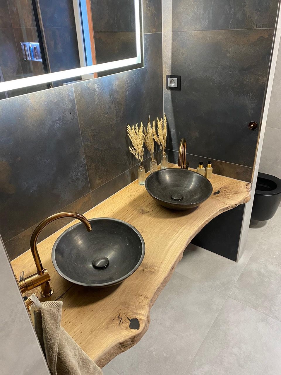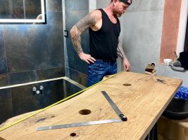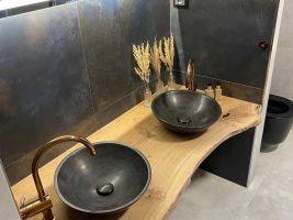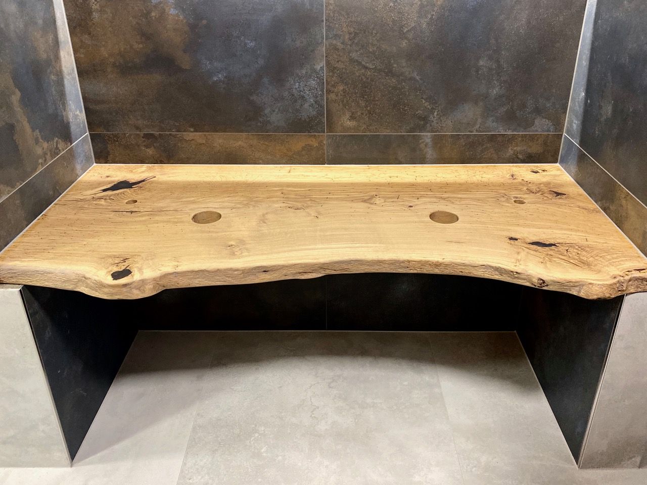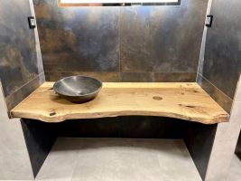 Umyvadlová deska je vyrobena z dubové fošny. Její okraj je zachovalý. Deska je umístěna ke zdi takzvanou mechanickou stabilizací. Ze spodu je upravena tak, aby byla rozměrově stabilní, tedy aby se nekroutila a zůstala tak na svém místě. Umyvadla jsou posazena na vrh na pultu, který je zakotven na skrytých konzolích na zdi, takže nevidíme nic a deska se pohledově vznáší.