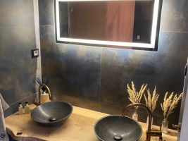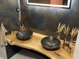 Koupelně v horském apartmánu dominují zcela unikátní dřevěné kousky