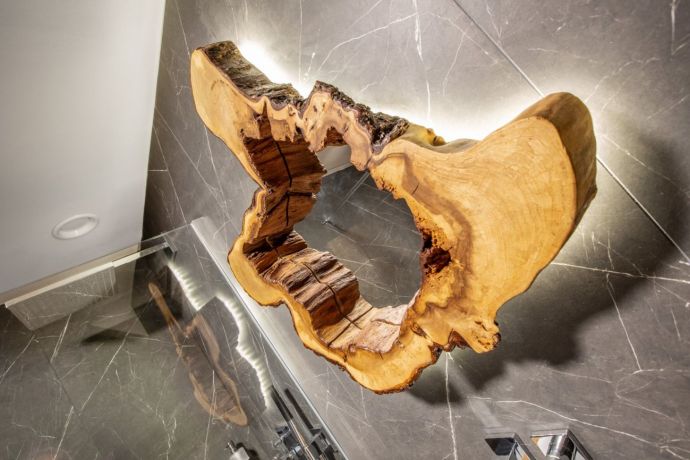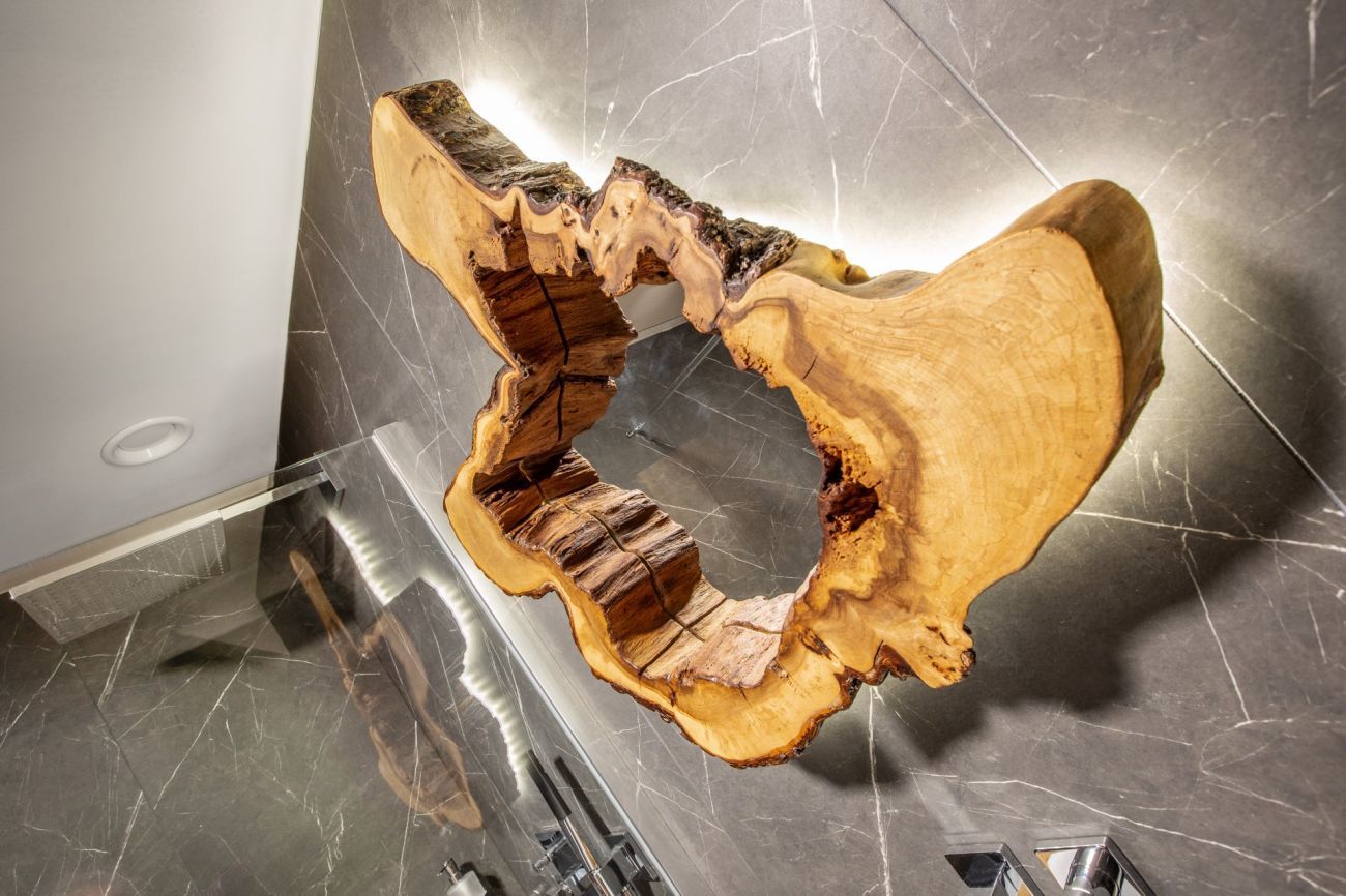 Každý z pokojů má svůj solitérní kus nábytku ze dřeva starých stromů, který jednotlivým místnostem dominuje. V koupelně je to unikátní umyvadlová deska a také zrcadlo posazené do výřezu stromu.