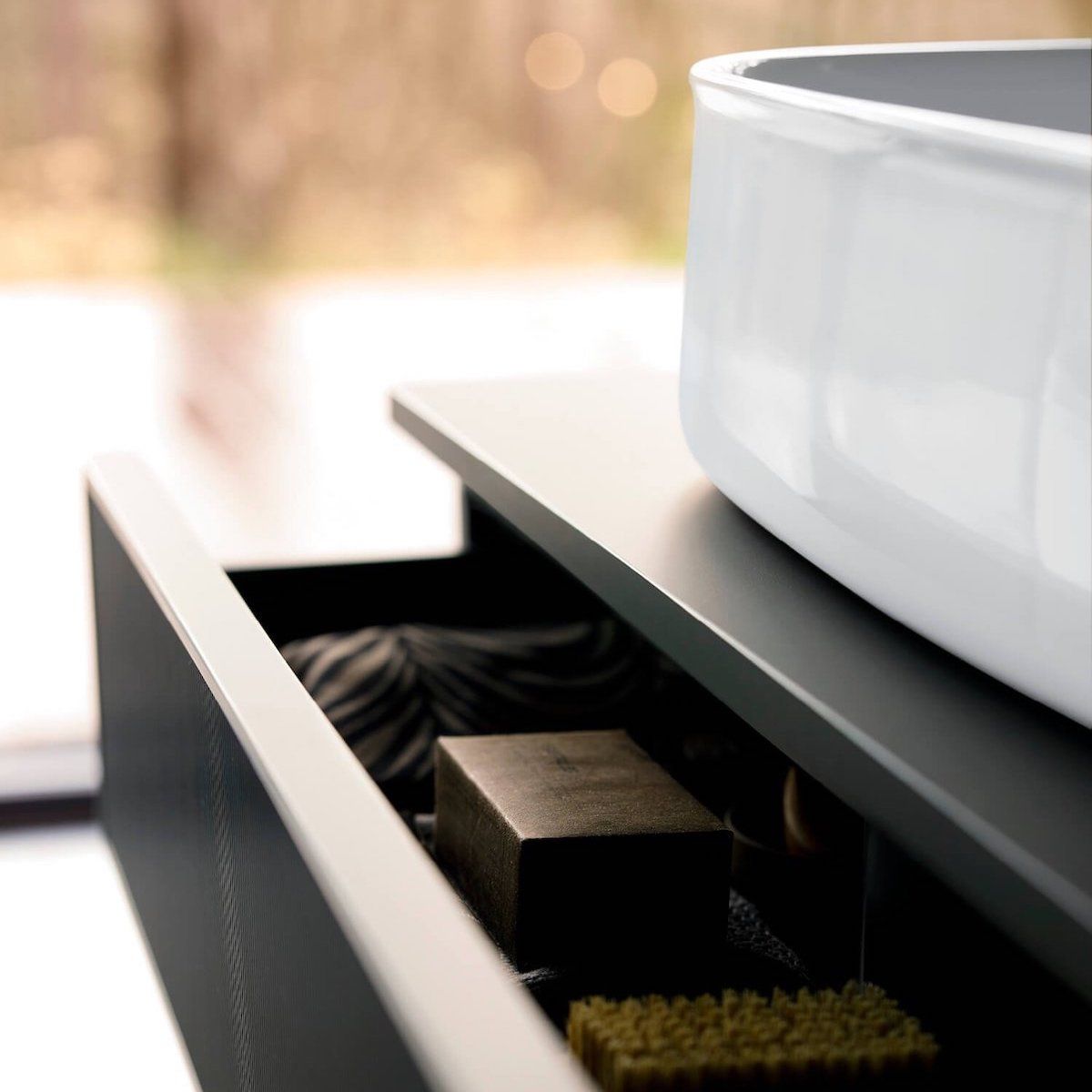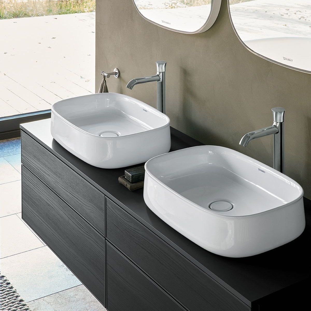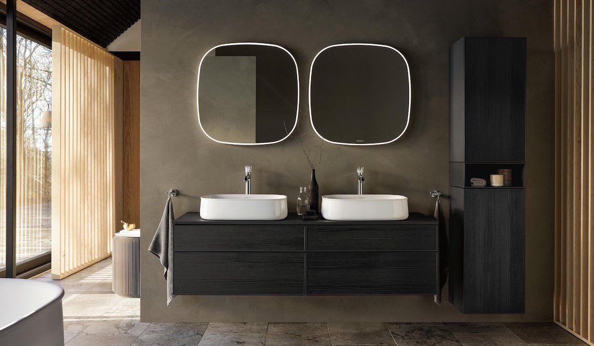 Dvoustěnné sanitární vybavení vyrobené z DuraCeram® a DuraSolid® jsou kombinovány s modulárním geometrickým koupelnovým nábytkem s elegantním rámem. Nábytek je vyroben z materiálů jako dřevo a strukturované sklo a nabízí dostatek úložného prostoru.