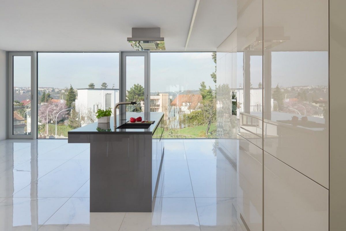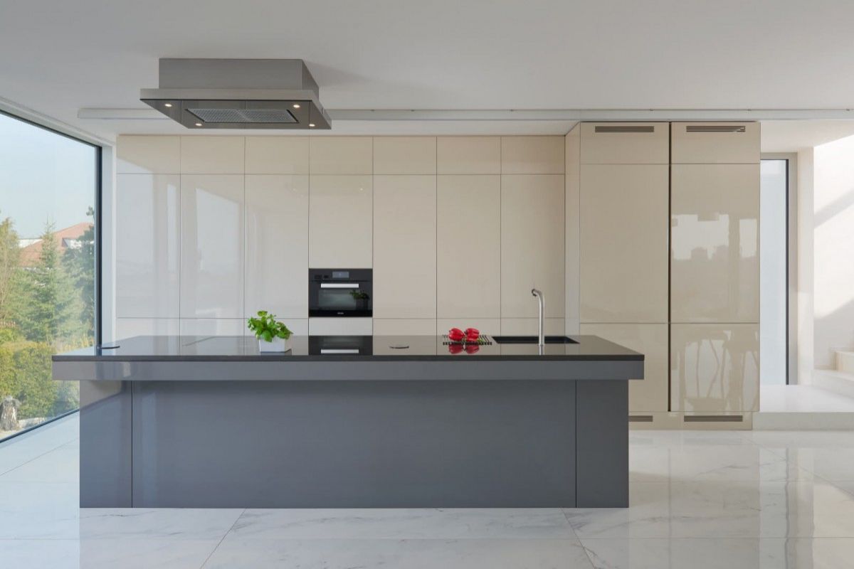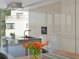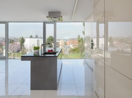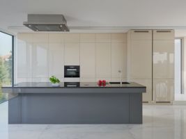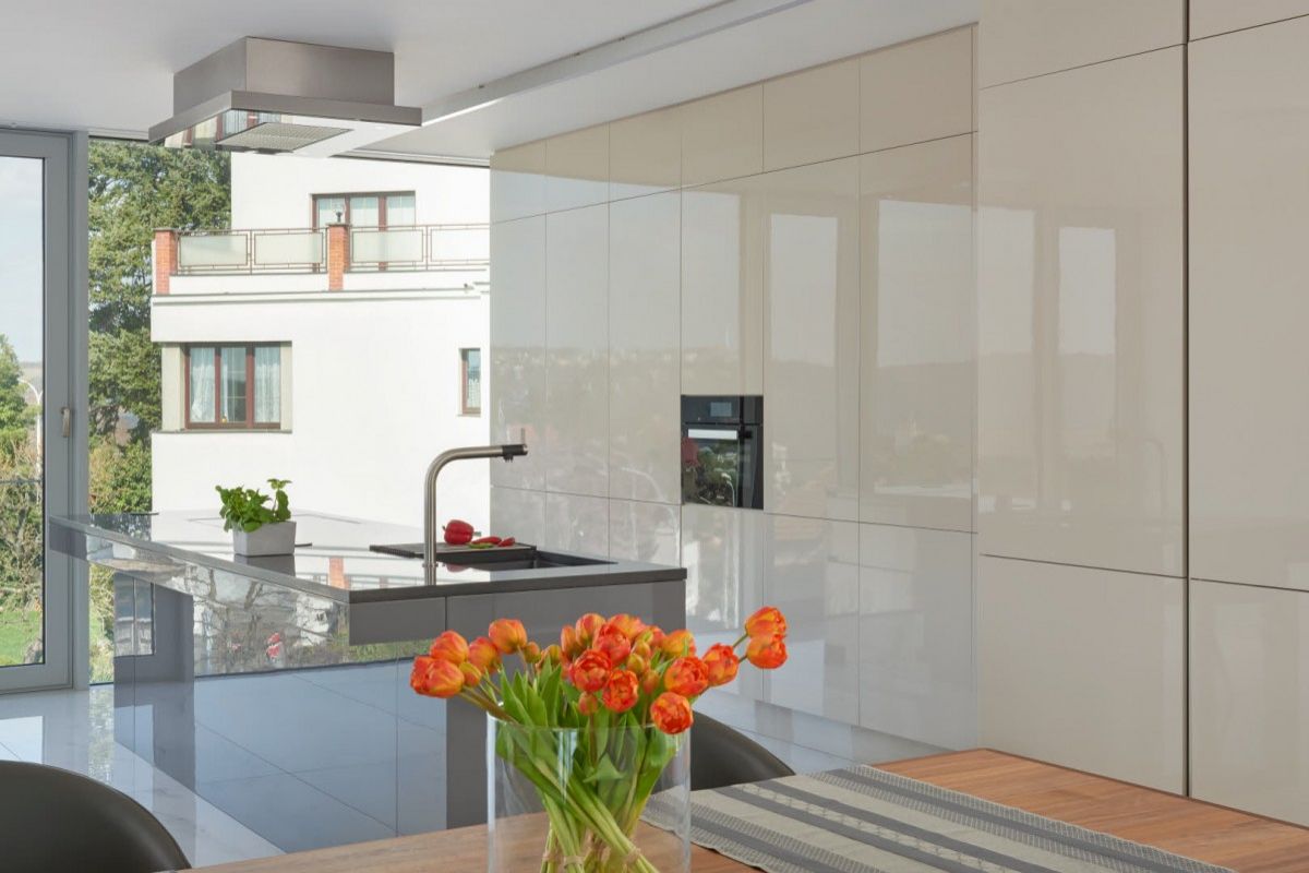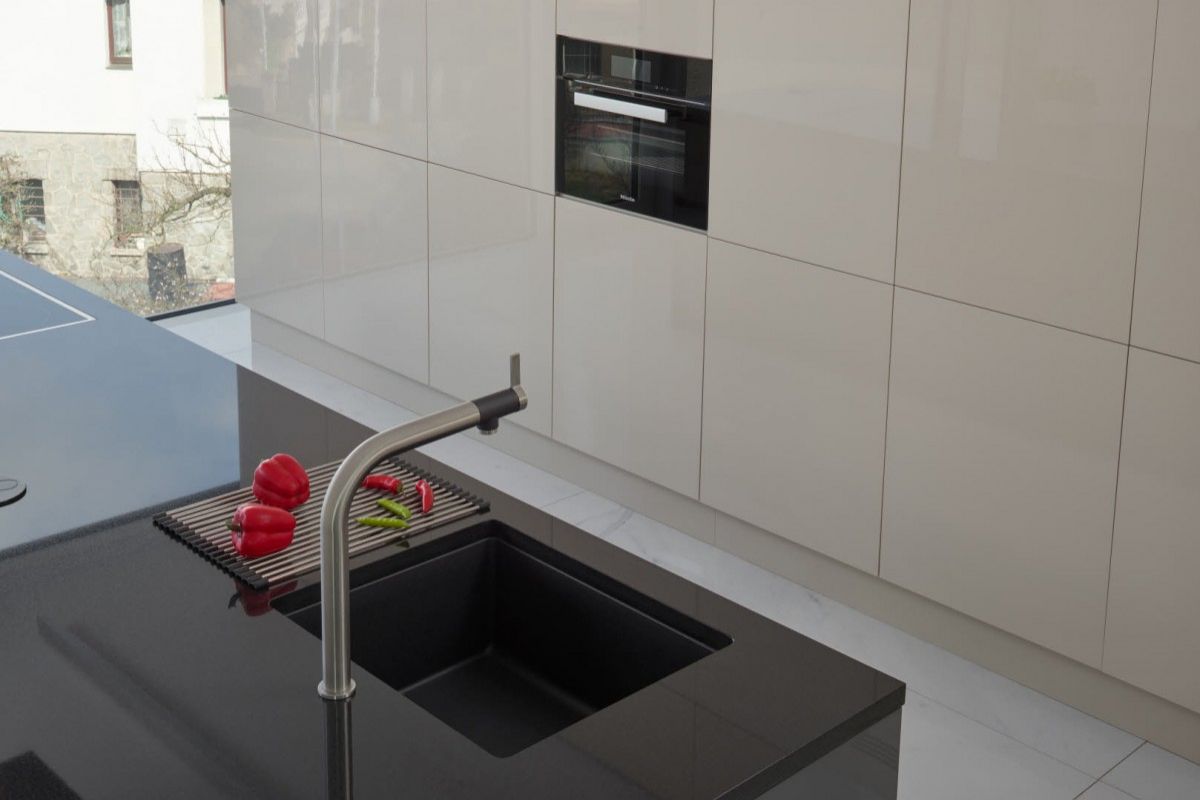 Jednalo se o kuchyni od českého výrobce Hanák ve vysokém lesku s atypickými spoji dveří, s korpusem u technických skříní a s lakovanou mřížkou přímo do dveří.