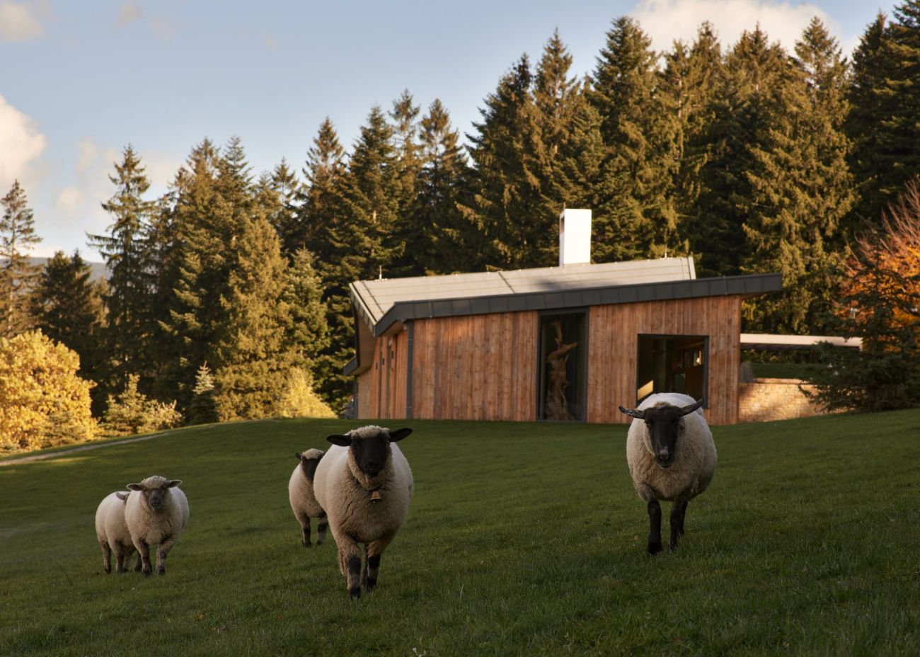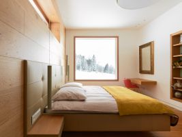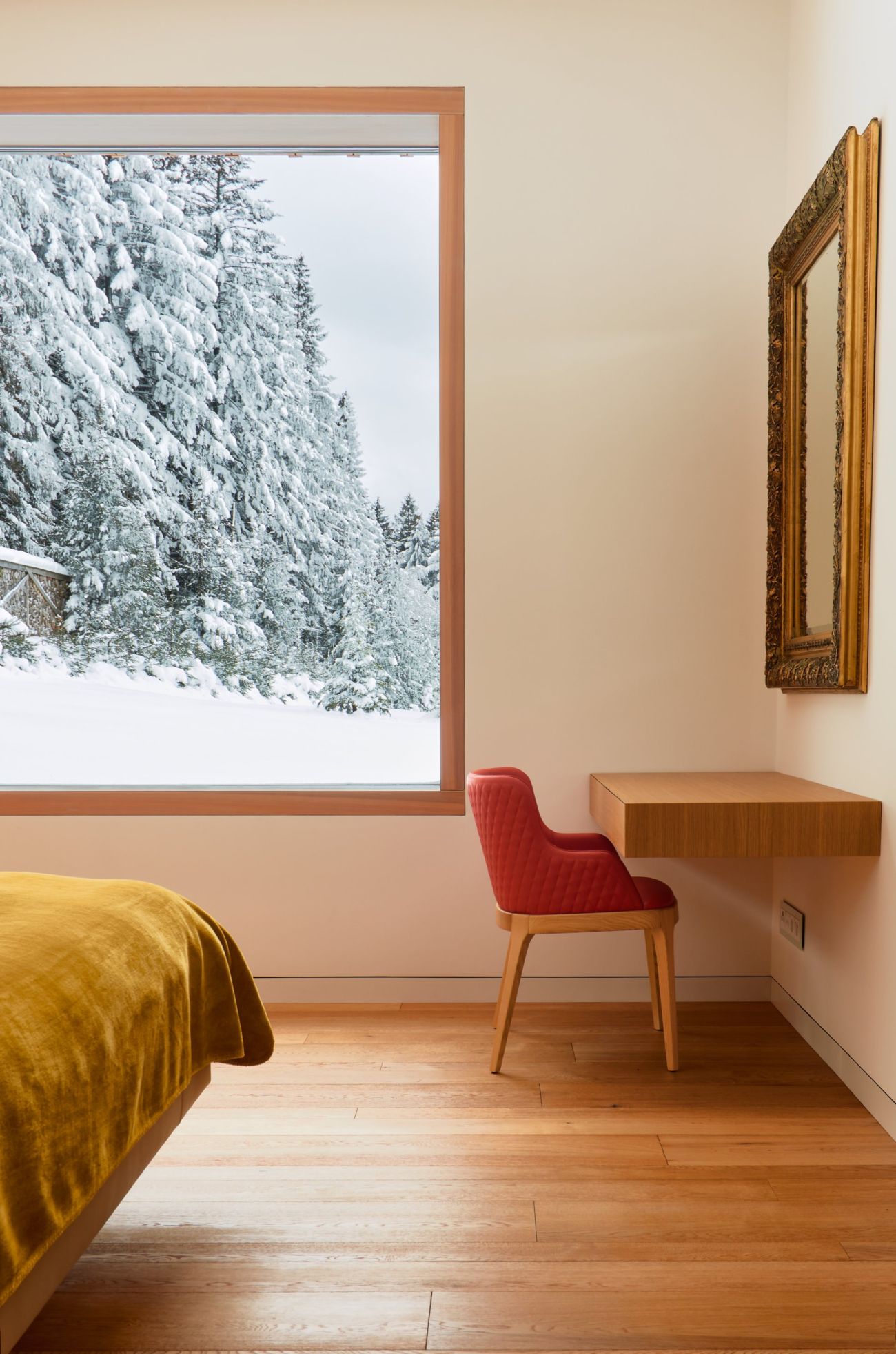 Atypickým prvkem v domě je čtvercové okno v ložnici. V jiných místnostech totiž okna vedou od podlahy až po střechu. Je neobvyklé i svou konstrukcí, kdy rám je z masivního modřínového dřeva, prochází přes zeď, čímž vytváří simulaci obrazu se scenérií lesa s rybníkem, kdy se tento obraz mění zároveň s ročním obdobím.