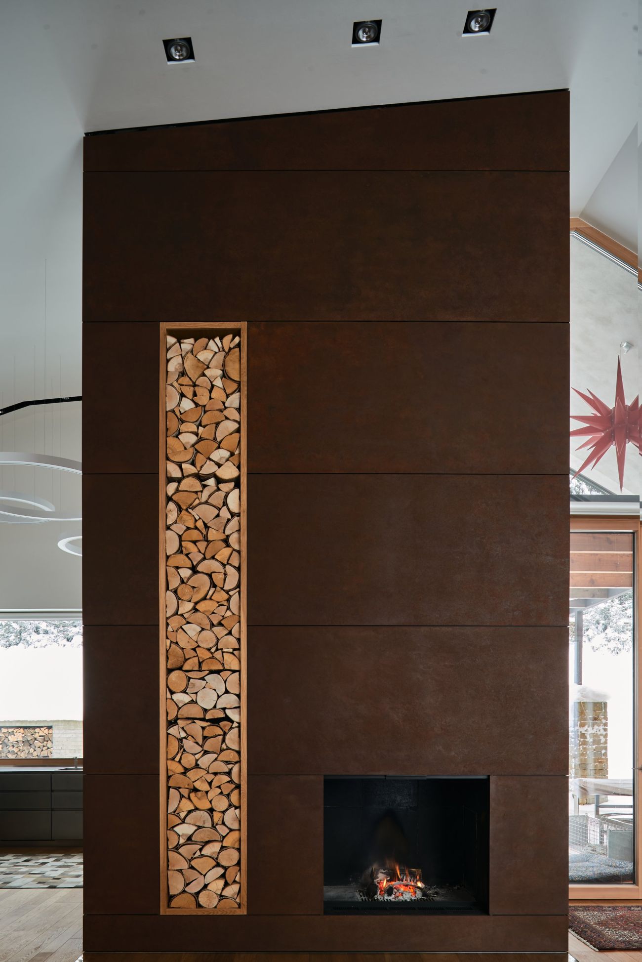 V obývacím pokoji je kromě velkoformátových oken další dominantou krb, který tvoří srdce domu. Dle požadavků majitele je krb zhotoven klasicky s otevřeným ohništěm. Krbová stěna byla vytvořena z materiálů Cor-Ten. Ke konstrukci krbu byly využity staleté zkušenosti jihoafrických odborníků, kteří při konstrukcích krbů plechové, litinové či prosklené vložky nepoužívají. Krb je plně funkční bez sebemenšího úniku kouře do interiéru, a to v jakýchkoliv venkovních podmínkách i v případě zatápění.