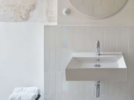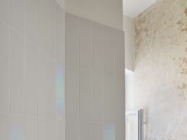Kuchyňskou linku autorky vsadily do nově vzniklé niky mezi kuchyní a obývacím pokojem, obě místnosti propojuje výdejní okénko, které bylo v dávných dobách často k vidění. Původní dřevěnou podlahu v ložnici doplňuje ve zbytku interiéru jednotná světlá stěrka. Hravým detailem jsou pak drobné podlouhlé dlaždičky v koupelně. Většina z nich je bílá, některé pak architektky záměrně zvolily s odrazivým efektem, který pod světlem mění barvy. Tento prvek tak minimalistické koupelně dodává zajímavou dekorativní vrstvu.