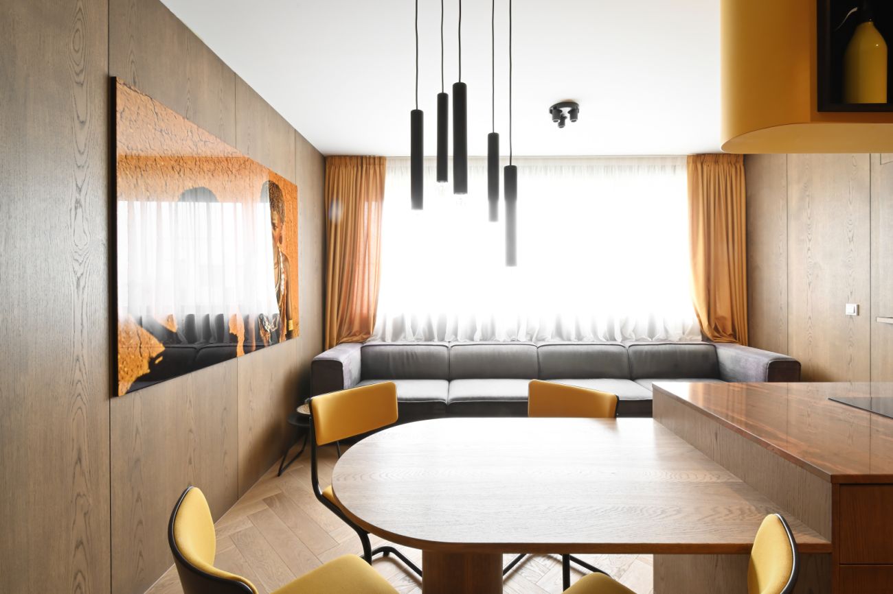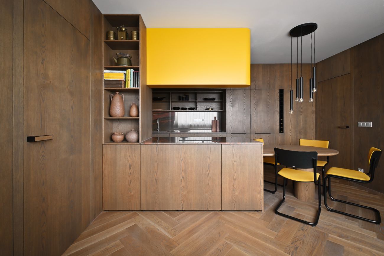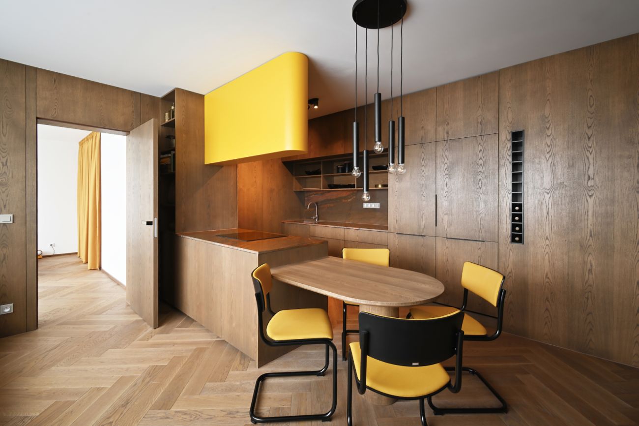Rustikální notu bytu doplňuje v reprezentativních prostorech vstupní haly a obývací pokoje obklad stěn z panelů, dýhovaných kouřovým dubem. Kontrastem k této jednotné paletě je využití okrového detailu jako čalounění židlí, závěsy nebo celá atypická na míru vyrobená zakulacená digestoř skrývající odkládací plochy. V případě kuchyně je tato barevná škála doplněna o žulové pracovní desky. Kuchyňská linka i další zařízení bylo zhotoveno na míru.