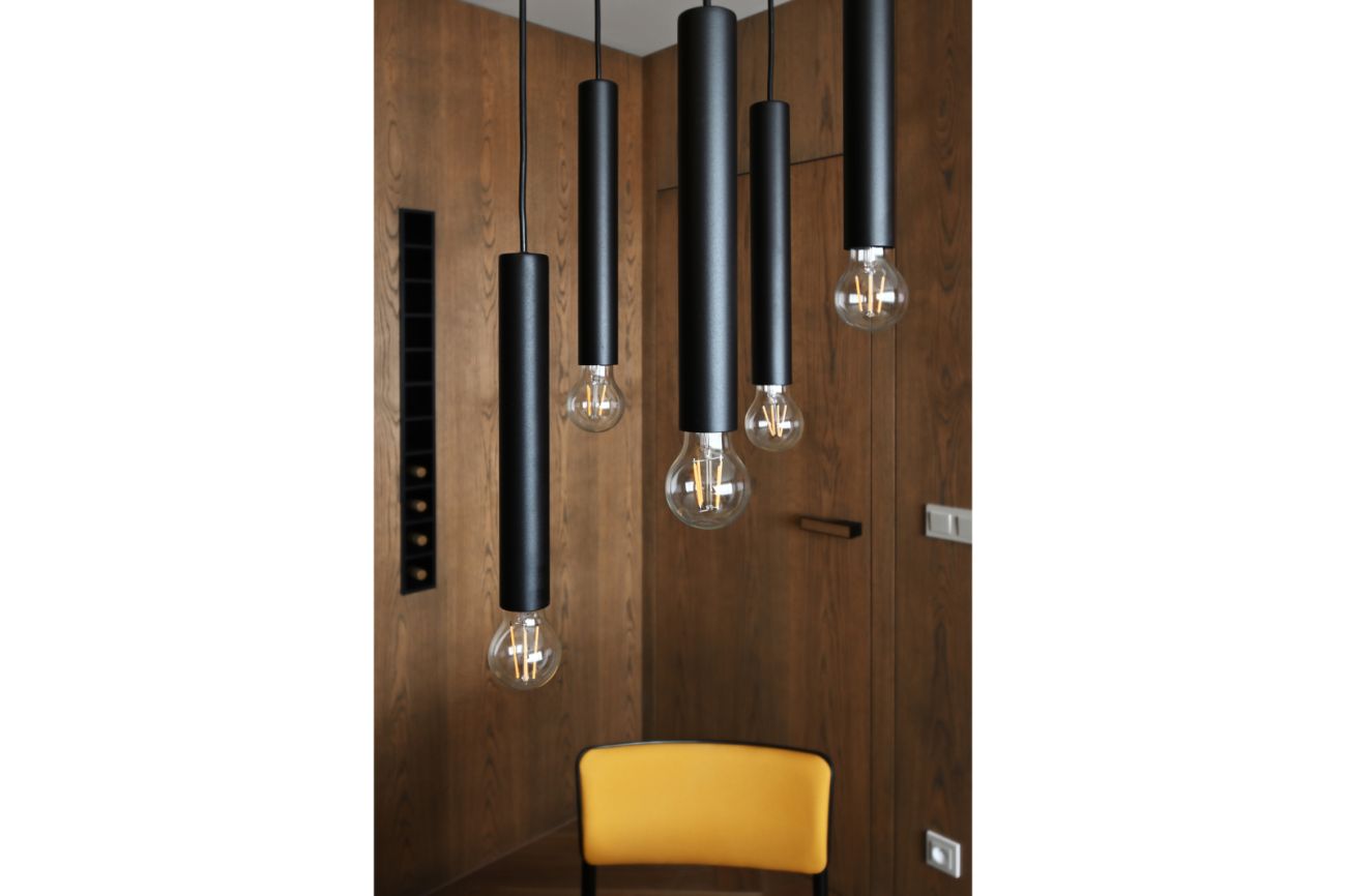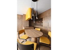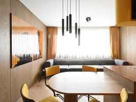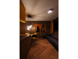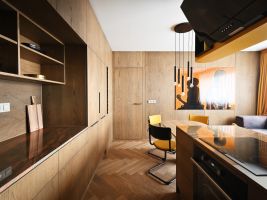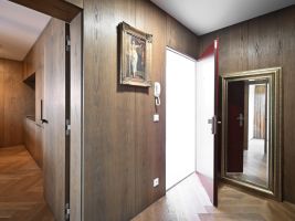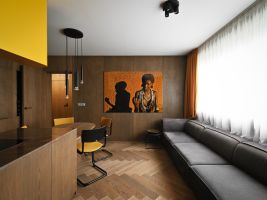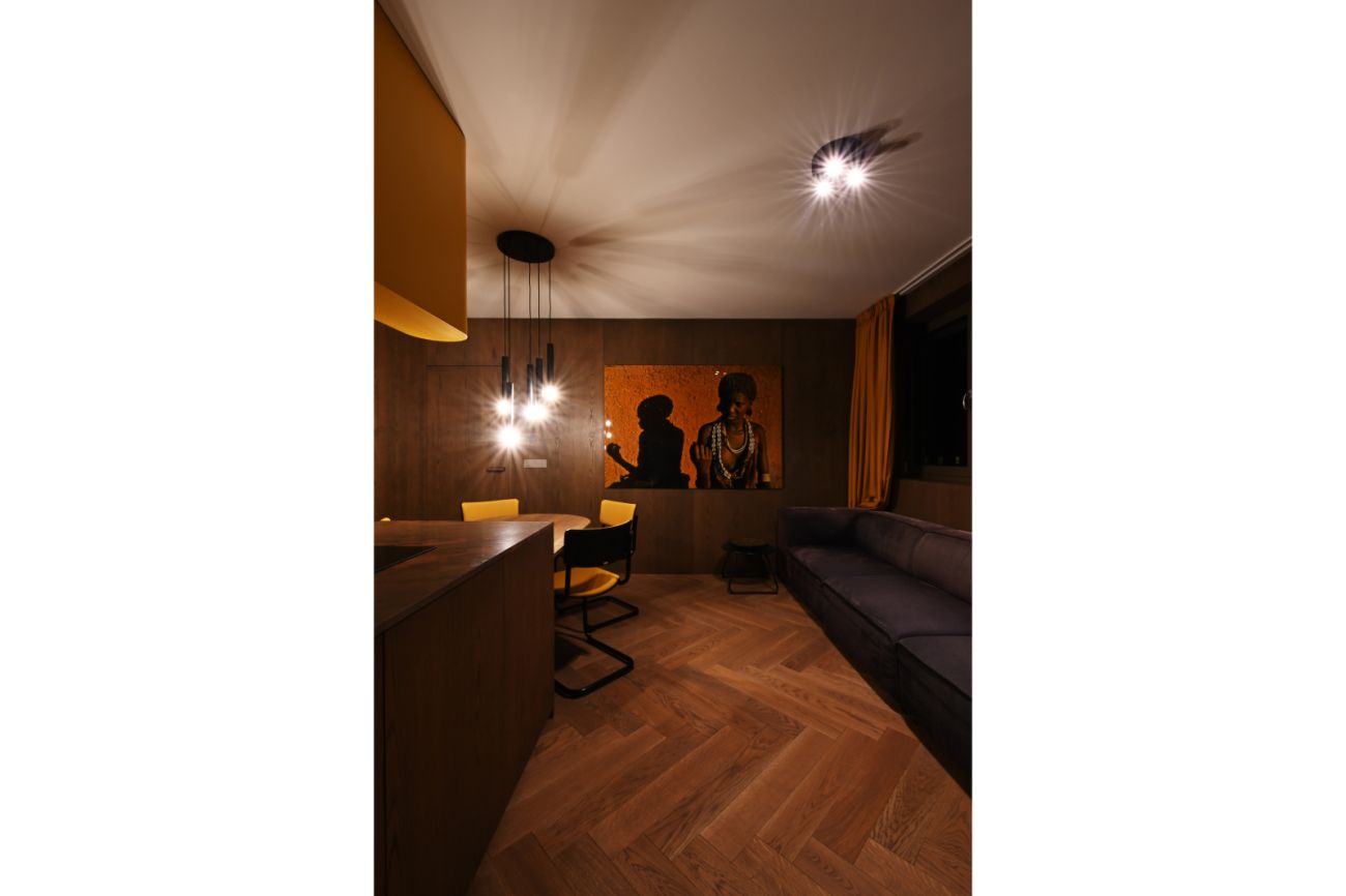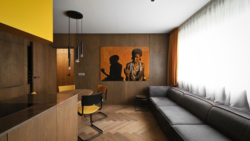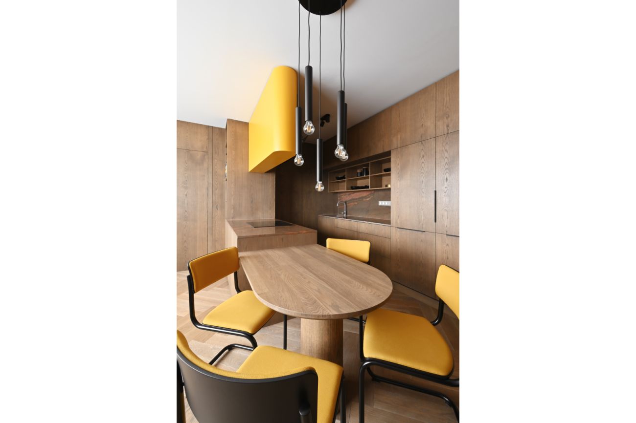Rustikální notu bytu doplňuje v reprezentativních prostorech vstupní haly a obývací pokoje obklad stěn z panelů, dýhovaných kouřovým dubem. Kontrastem k této jednotné paletě je využití okrového detailu jako čalounění židlí, závěsy nebo celá atypická na míru vyrobená zakulacená digestoř skrývající odkládací plochy. V případě kuchyně je tato barevná škála doplněna o žulové pracovní desky. Kuchyňská linka i další zařízení bylo zhotoveno na míru.