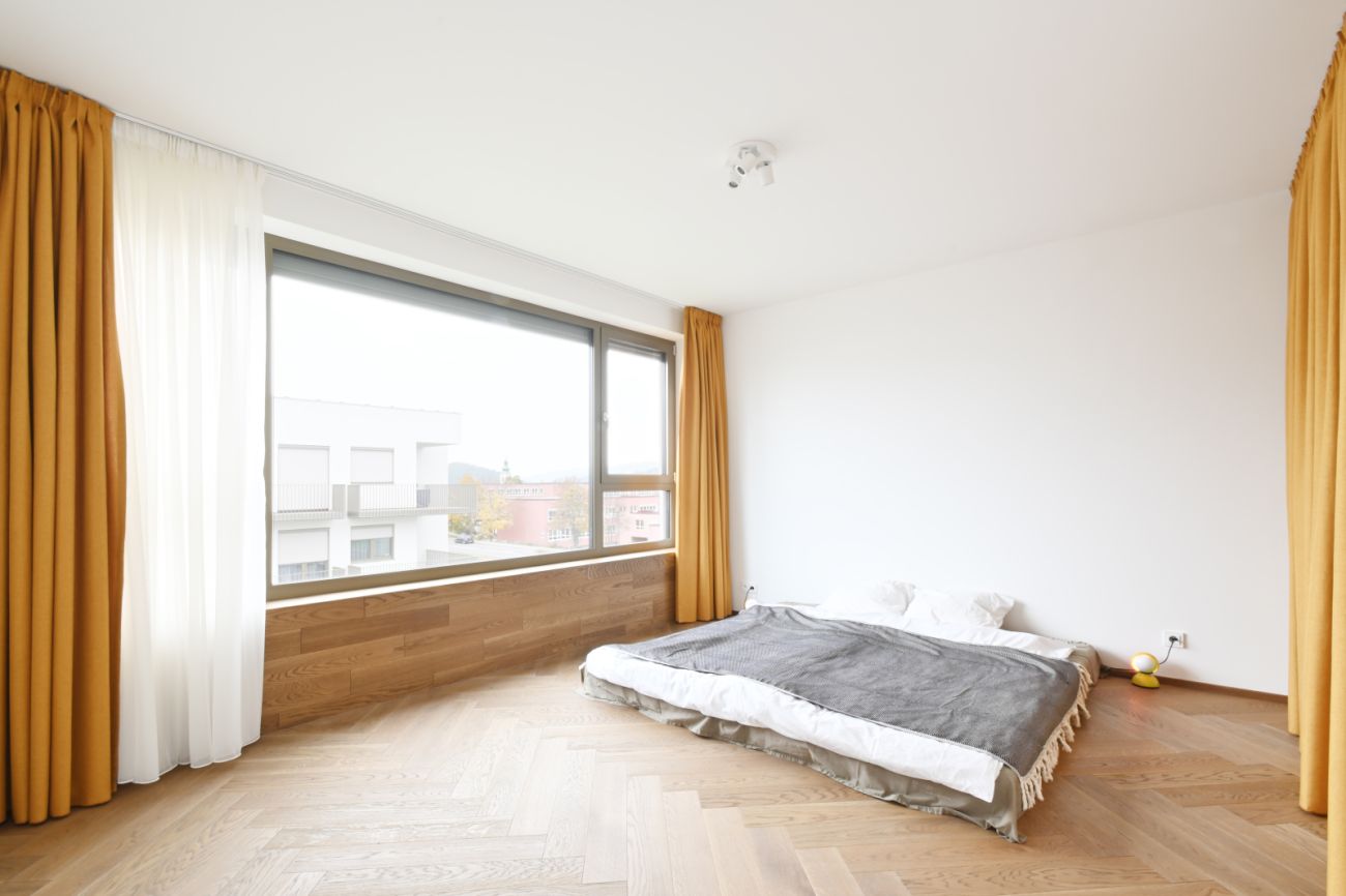 „Bytu se střešní terasou a saunou byl unikátním zadáním umožňujícím zkoušku nových myšlenek interiérového design. Celý byt využívá jednotnou dřevěnou parketovou podlahu z kouřového dubu,“ uvádí architekti z ateliéru Menšík Skrušný Architects + Builders.