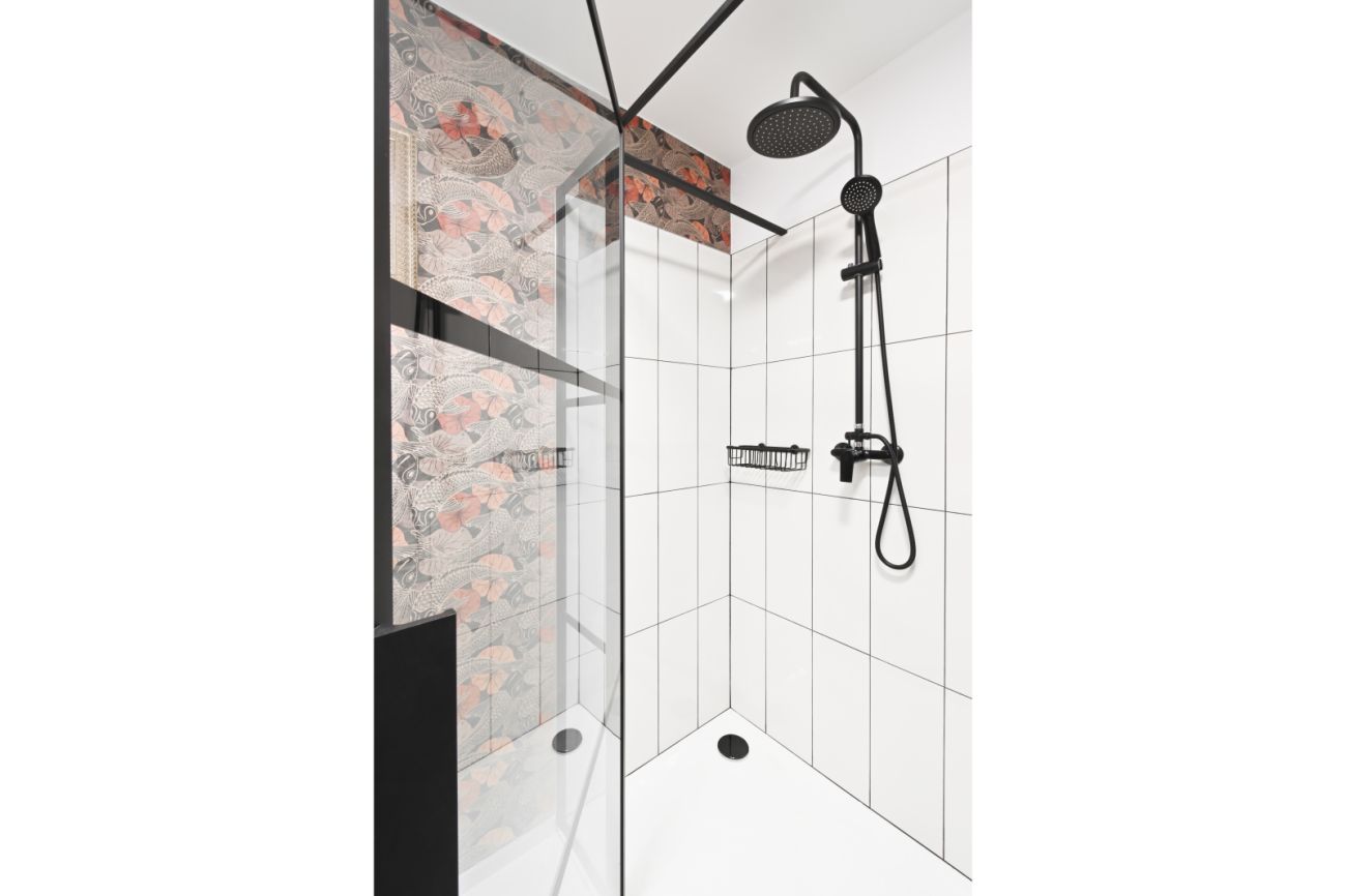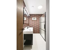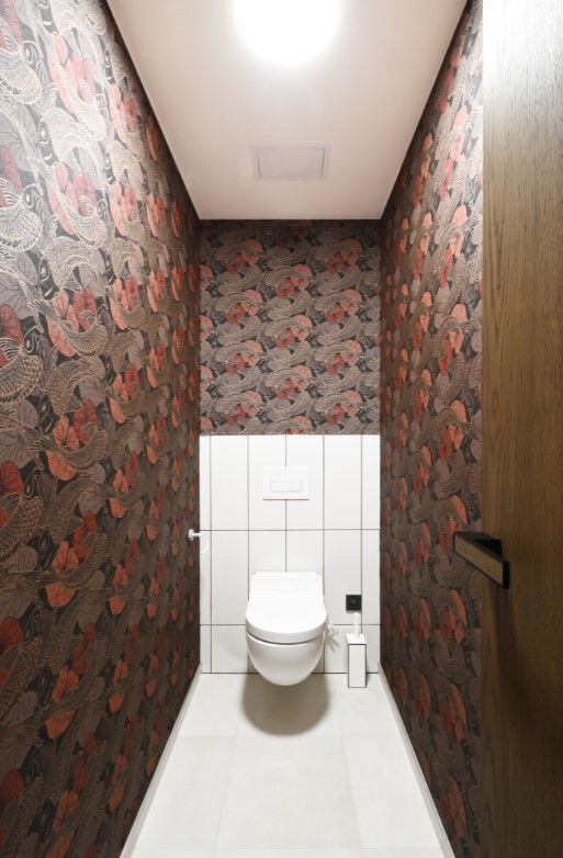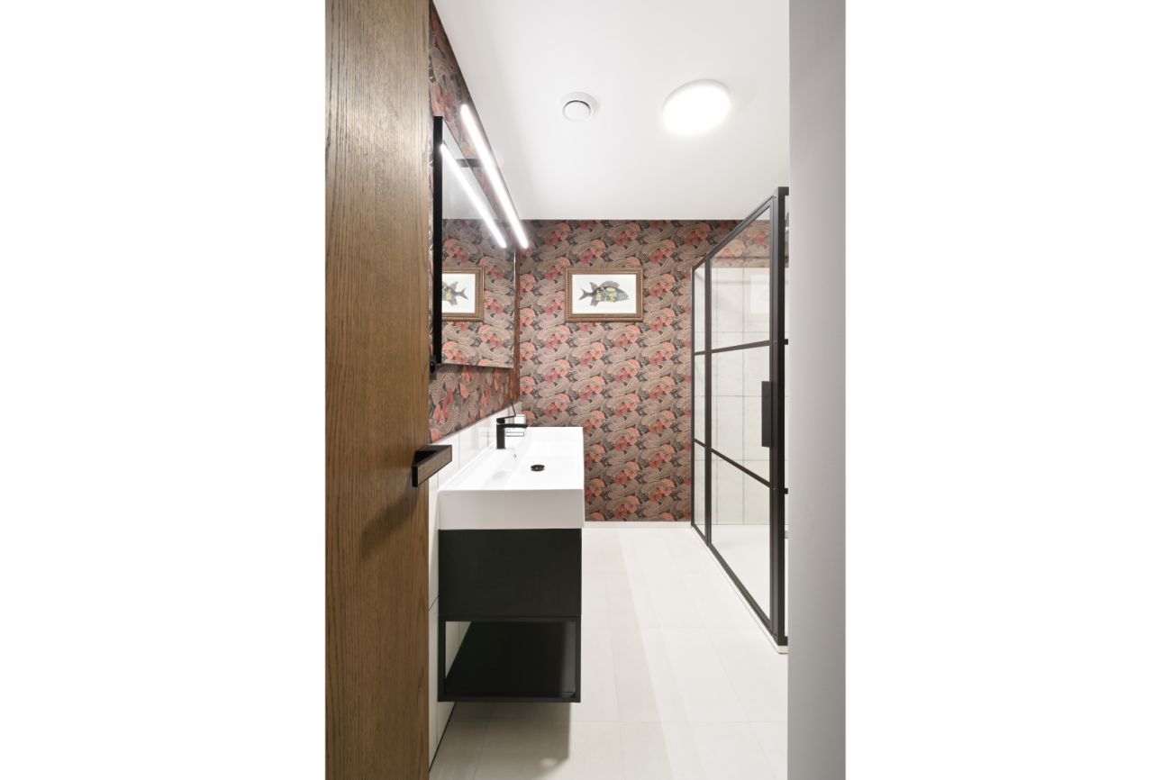Zajímavým prvkem jsou například dveře s nadstandardní výškou 2,1 m či voděodolná tapeta s KOI kapry, která provází všechny hygienické místnosti. Zbytek koupelny a záchodu je doplněn o bílou keramiku a černý detail zařizovacích předmětu nebo doplňků.