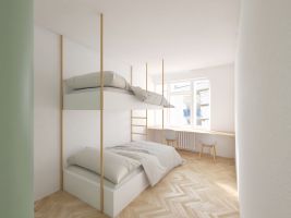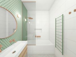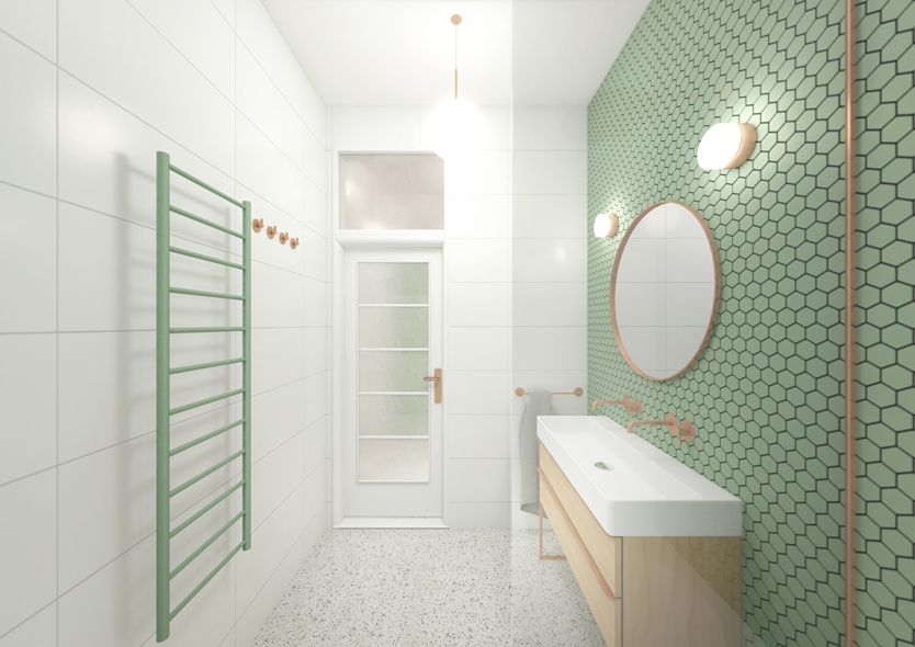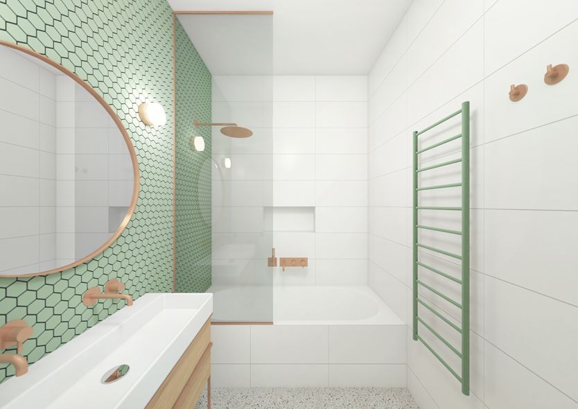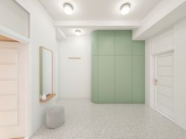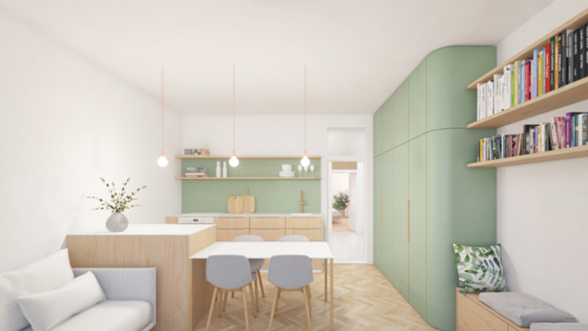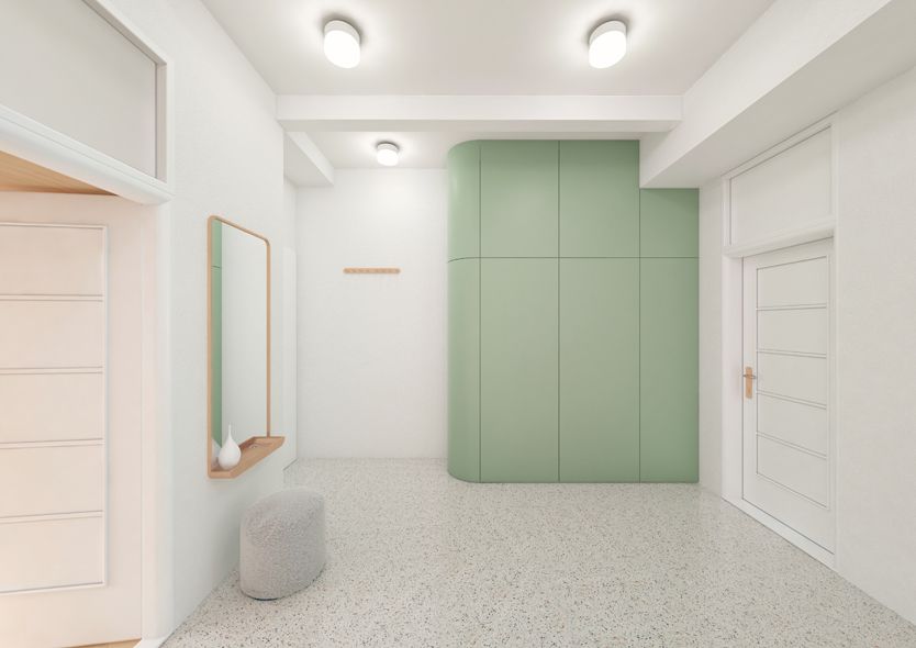 Mátová barva je zde využita především na solitérních kusech nábytku a také v koupelně, kde je na mozaice složené z hexagonů. Architekti při tvorbě interiéru využili také dřevo ve světlé barvě, které mátová skvěle doplňuje. „Materiály jsou kombinace březové překližky a barevného ohýbaného lamina mátové barvy. Kombinace je volena ve světlých odstínech tak, aby ladila a hlavně se neokoukala. Lehkost interiéru je poté tvořena zaoblenými hranami nábytku,“ říká Svoboda.