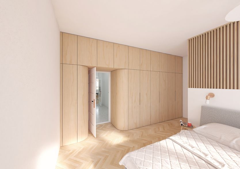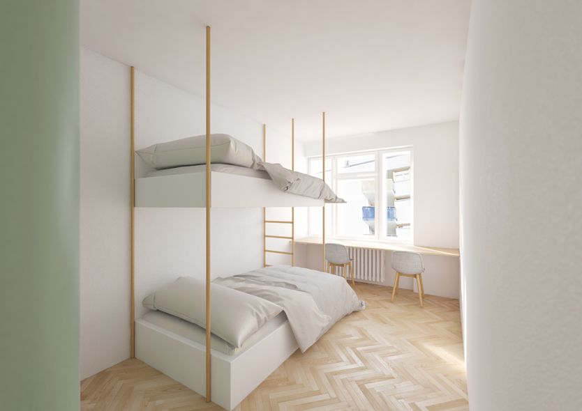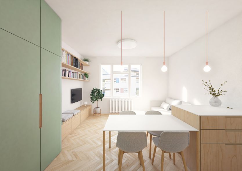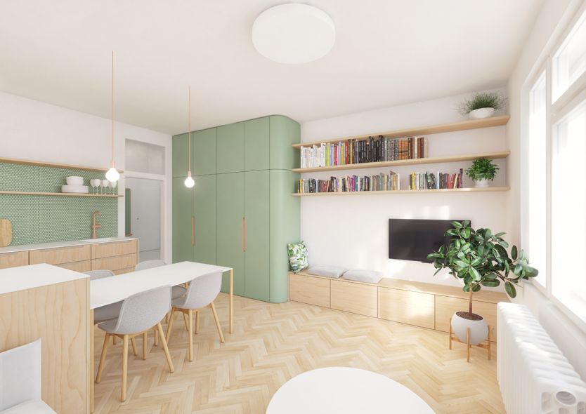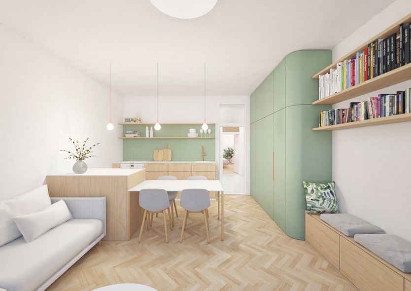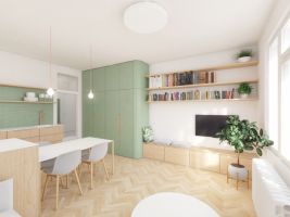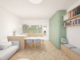 Interiér bytu se nachází v jednom ze starých činžovních domů na pražském Smíchově. Jeho dispozice je 3+kk. „Jedná se o kompletní rekonstrukci starého bytu, ovšem při proměně nedošlo na žádné zásadní stavební úpravy a změnu dispozice. Jen lehce jsme posunuli příčky,“ říká architekt Vít Svoboda z 0,5 studio.