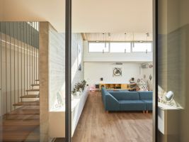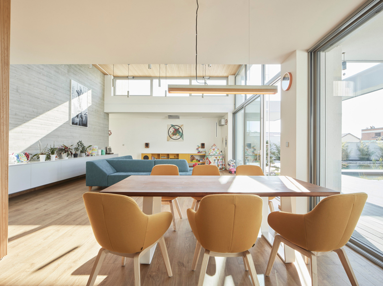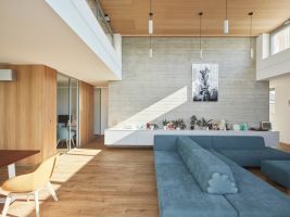 Většina prvků v interiéru je dělaná na míru. Důraz byl kladen na kombinaci betonu, dřeva a barevných akcentů. Tak, aby navazoval na koncept domu a zároveň byl nadčasového charakteru.