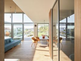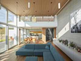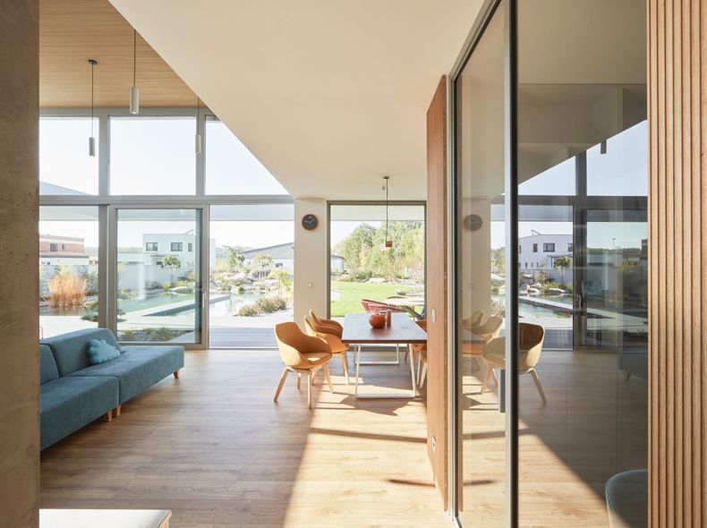 V interiéru najdeme halu se schodištěm, která tvoří předěl mezi obytným prostorem a provozní částí. „Strop obytného prostoru je nad hlavní částí vynesen nad prvek horizontální desky, a tak do středu proniká denní světlo ze všech stran. Světlo akcentuje betonovou stěnu a jasně definuje srdce domu. Díky maximálnímu prosklení je obytný prostor v přímém kontaktu se zahradou a biotopem,“ říkají architekti z ateliéru 0,5 studio.