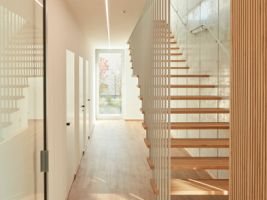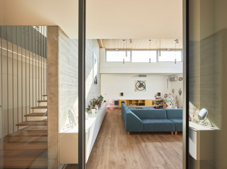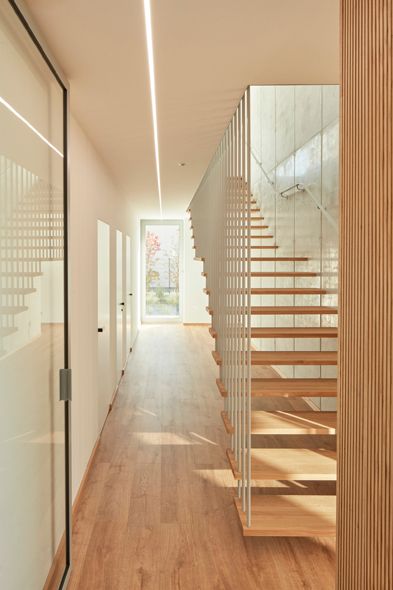 Odlehčené konzolové schodiště s betonovou stěnou prostupuje celým prostorem z haly až do prvního patra. V patře jsou umístěny dva dětské pokoje, pokoj pro hosty a hygienické zázemí. Všechny místnosti jsou přístupné z haly.