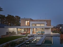 Zatímco do ulice dům působí velmi minimalisticky, do zahrady je nasměrovaná členitá podoba stavby. Celkově je dům kompaktní a má tři základní prvky - přízemí, horizontální stropní desku a odlehčené ustupující patro. Toto členění je podtrhnuto využitím rozdílných fasádních materiálů. Výrazným prvkem architektury domu je horizontální deska s přesahem kolem celého obvodu. Tvoří zádveří, krytou terasu směrem do zahrady a podporuje charakter stavby.