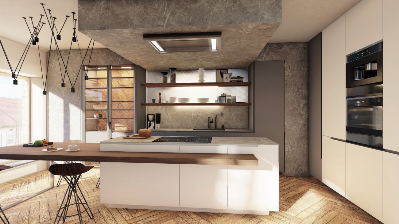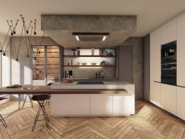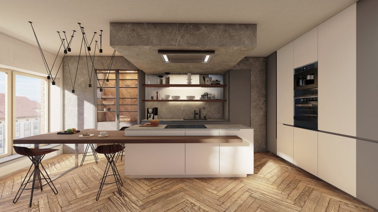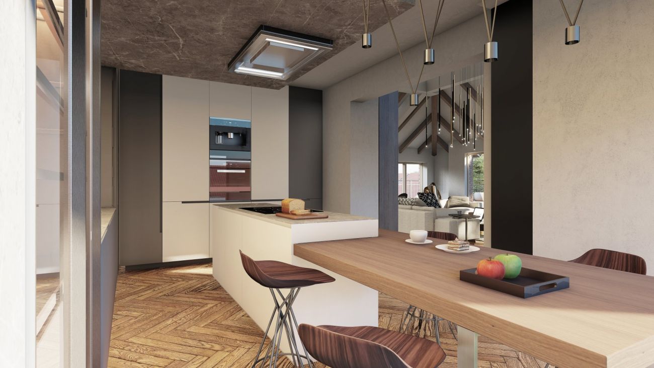 Prosklené části nabízí krásný a jedinečný výhled do okolí i proto je například jídelní stůl umístěn tak, aby se budoucí obyvatelé mohli i při večeři kochat pohledem na Prahu. Sama designérka přiznává, že se při práci setkává s menšími byty, kde je hlavním cílem maximálně využít daný prostor, aby i malé 2kk mělo dostatek úložného prostoru. Tady byl najednou problém úplně opačný.