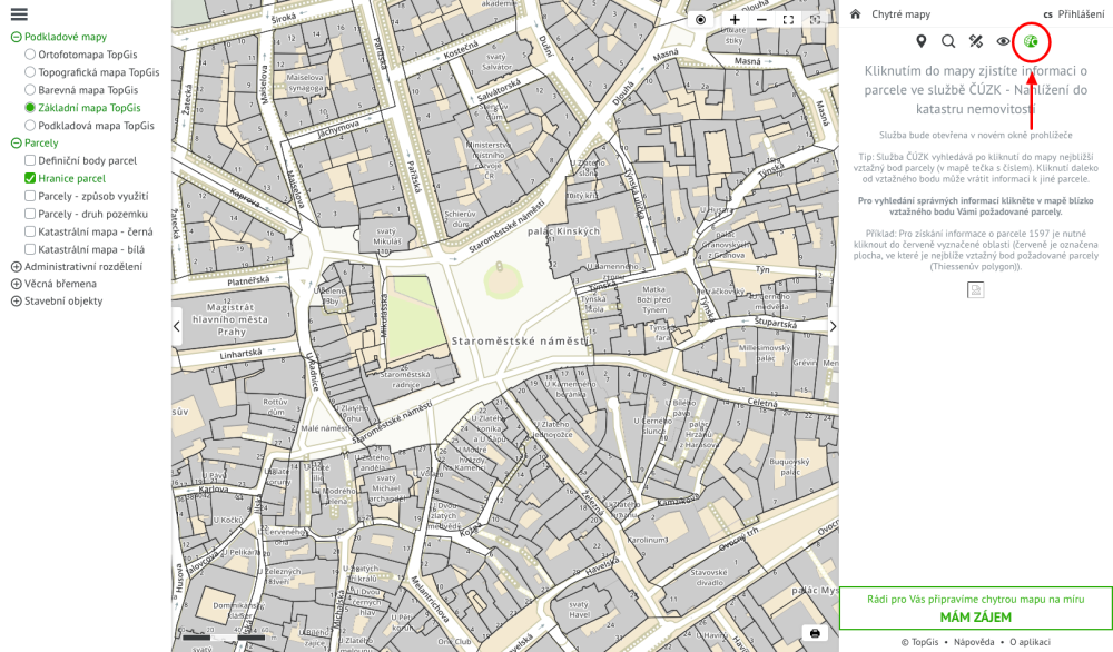 Spojení kvalitních leteckých snímků celé České republiky s přímým přístupem do katastru nemovitostí nabízí nová aplikace na webu Chytremapy.cz společnosti TopGis. Kromě toho v ní návštěvníci naleznou na jednom místě řadu dalších důležitých informací včetně panoramatického pohledu do ulic. Podívat se mohou i na věcná břemena, způsob vytápění či použitý materiál pro výstavbu budov. Přímo v aplikaci lze využít také nástroje na přesné měření.