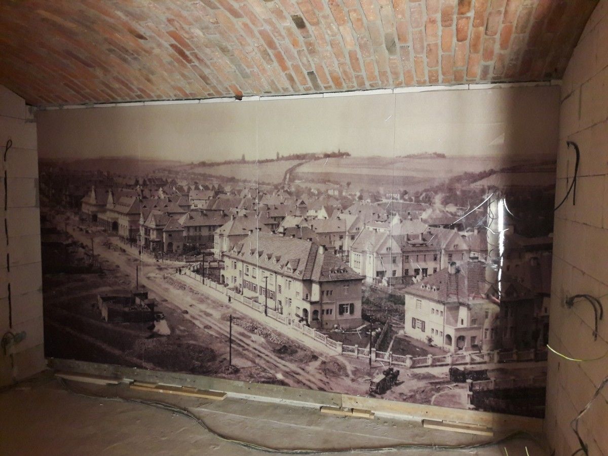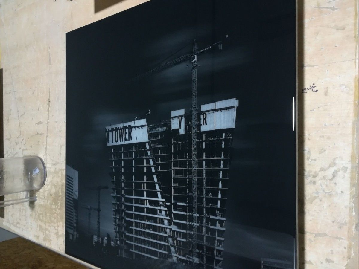 Na jedné z fotografii níže vidíte známou stavbu V-Tower, výsledné dílo bude použito jako obraz. Další fotografie je z nedokončené realizace dekorační stěny do vily v pražské Ořechovce.