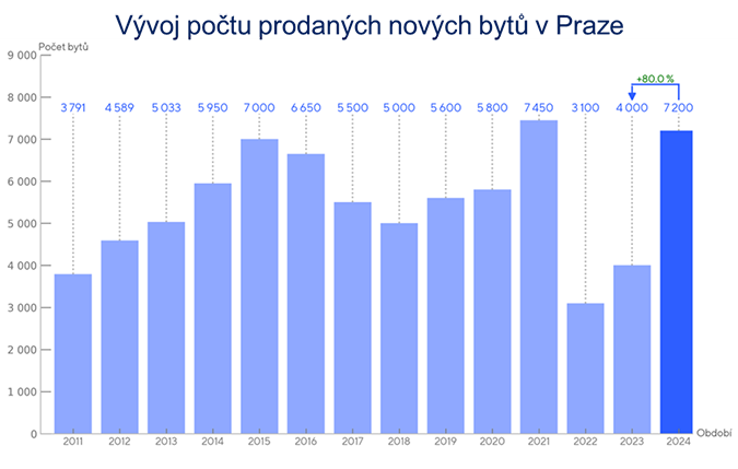 V roce 2024 se na pražském trhu s novými byty prodalo celkem 7 200 jednotek, což je druhý nejvyšší výsledek za posledních 15 let. Ve srovnání s předchozím rokem vzrostly prodeje o 80 %, což reflektuje zvýšený zájem o vlastnické bydlení.