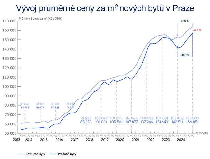 Průměrná nabídková cena nových bytů v Praze dosáhla na konci roku 163 203 Kč/m², což představuje meziroční nárůst o 7 %. Skutečné prodejní ceny vzrostly dokonce o 10 % na 156 851 Kč/m². Tyto hodnoty překonaly i prognózy České národní banky, která upozorňovala na možný rychlejší růst cen kvůli nepoměru mezi poptávkou a nabídkou.