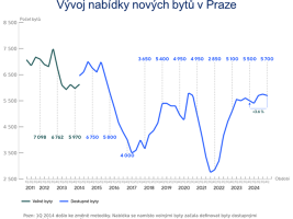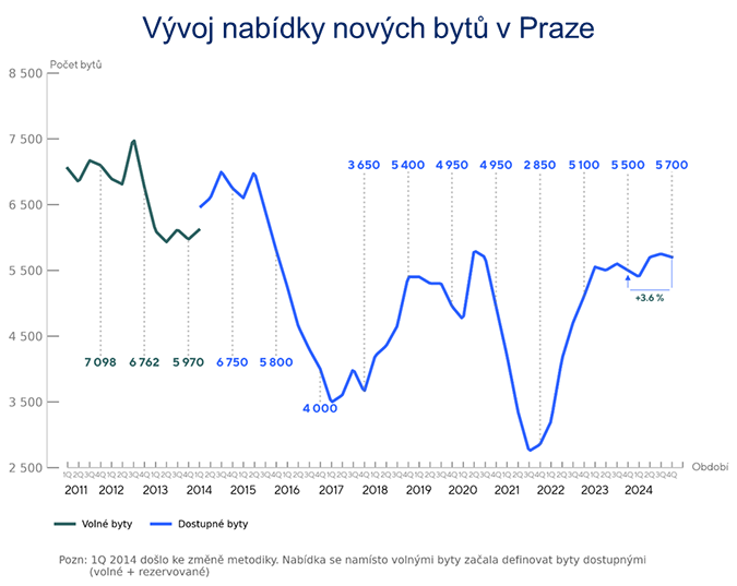 I přes vysokou poptávku zůstává nabídka nových bytů na podobné úrovni jako v předchozích letech. Na konci roku 2024 bylo v Praze dostupných 5 700 nových bytů, což je stále výrazně pod úrovní, která by pokryla současnou poptávku.
