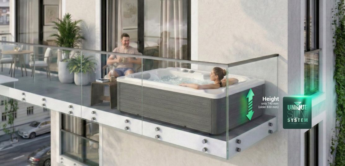 • Nová řada Unique Slim System umožňuje instalaci vířivek na terasy, balkony i střechy díky výšce od 74 cm a šířce od 125 cm