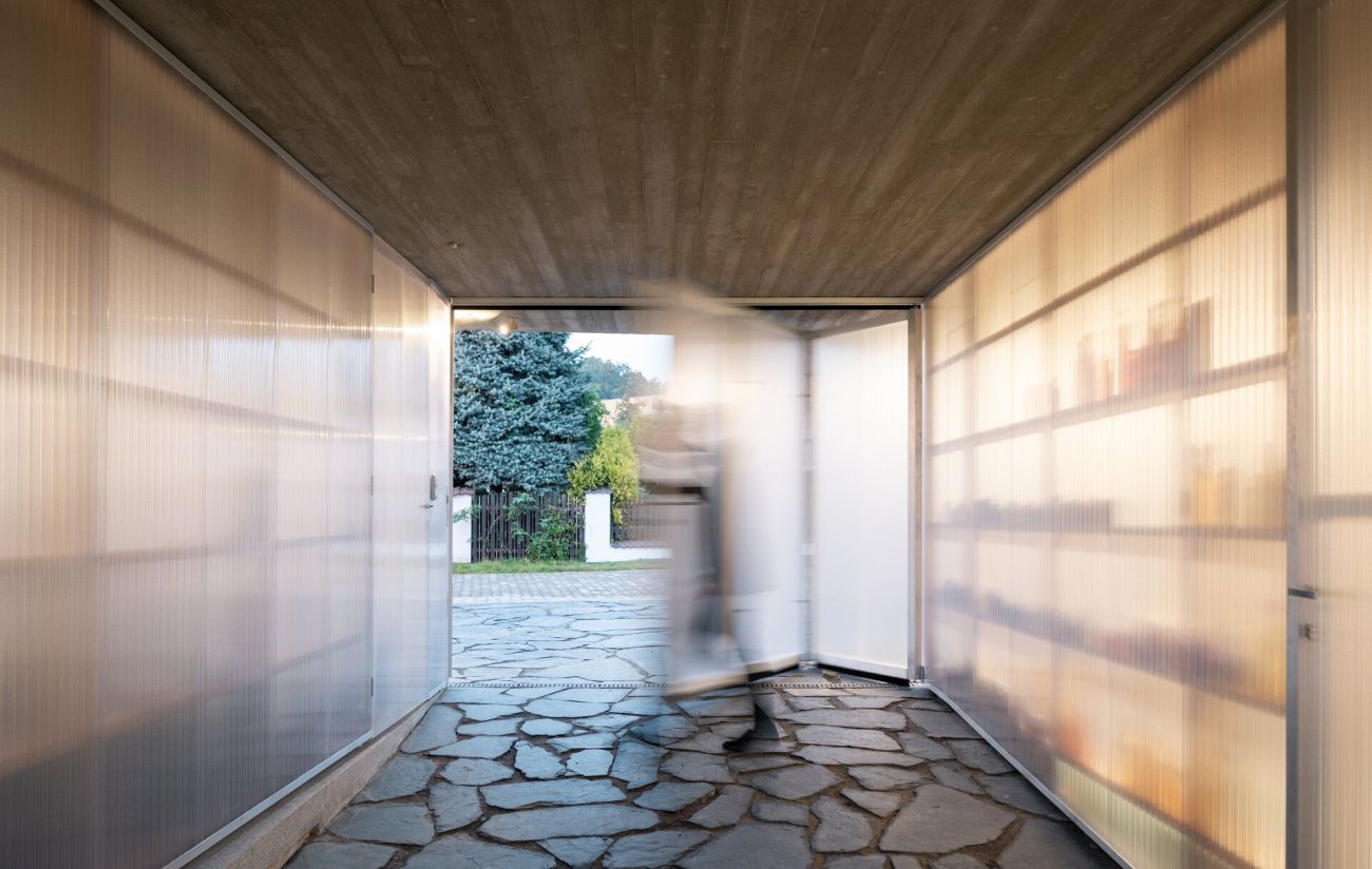 Dominantou je již zmiňovaná garáž a skladové prostory, které jsou z průsvitného polykarbonátu. Tato část zároveň odděluje obytnou část od ulice.