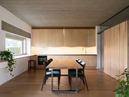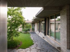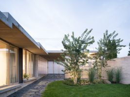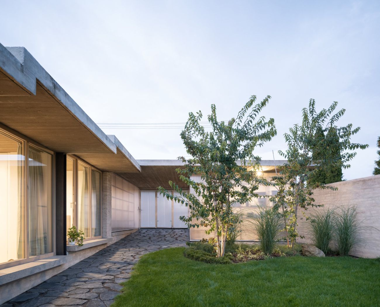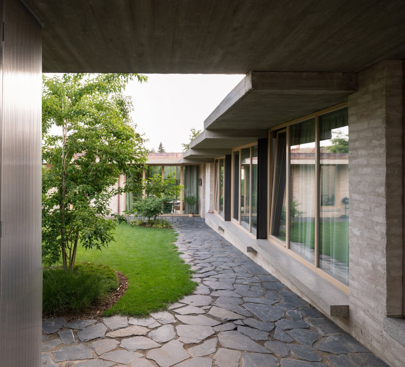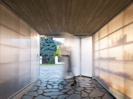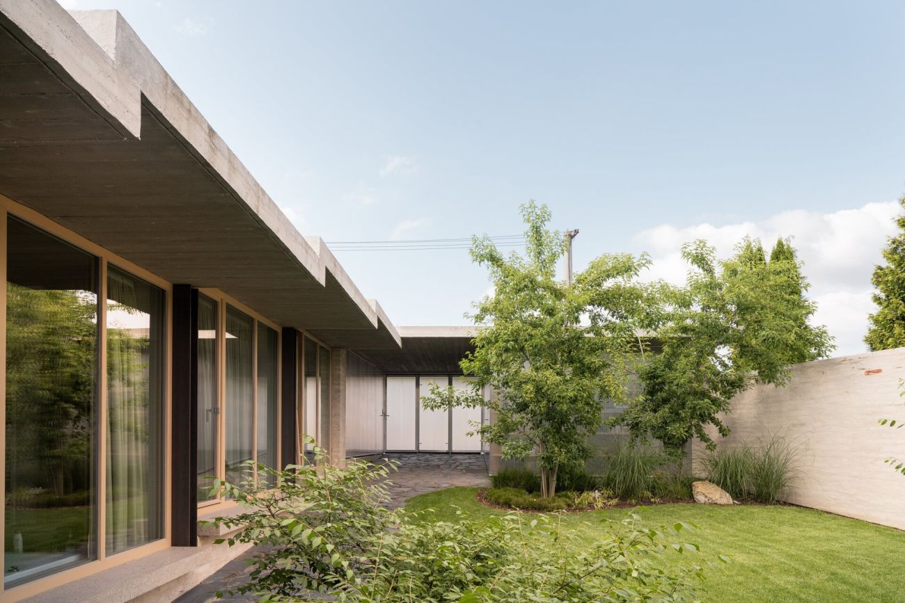 Život v domě se odehrává kolem atria a zahrady, ze kterých se vstupuje do vnitřních prostor. V létě je možné interiér otevřít na severní i jižní stranu a proměnit celý prostor v jeden celek. Železobetonové stropní desky mají velké přesahy, a tak chrání před sluncem i deštěm a zároveň vytváří příjemná místa na hraně domu a zahrady.