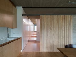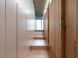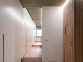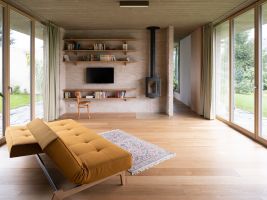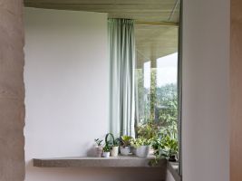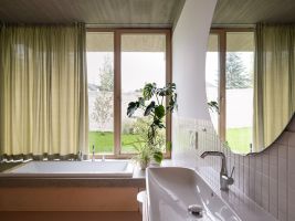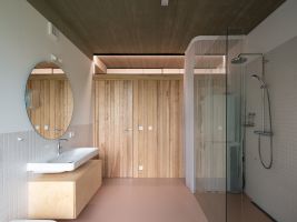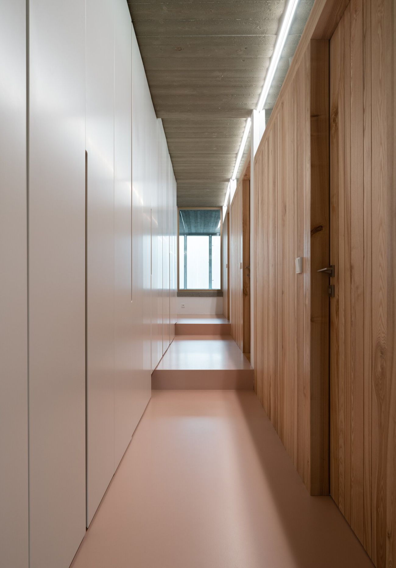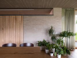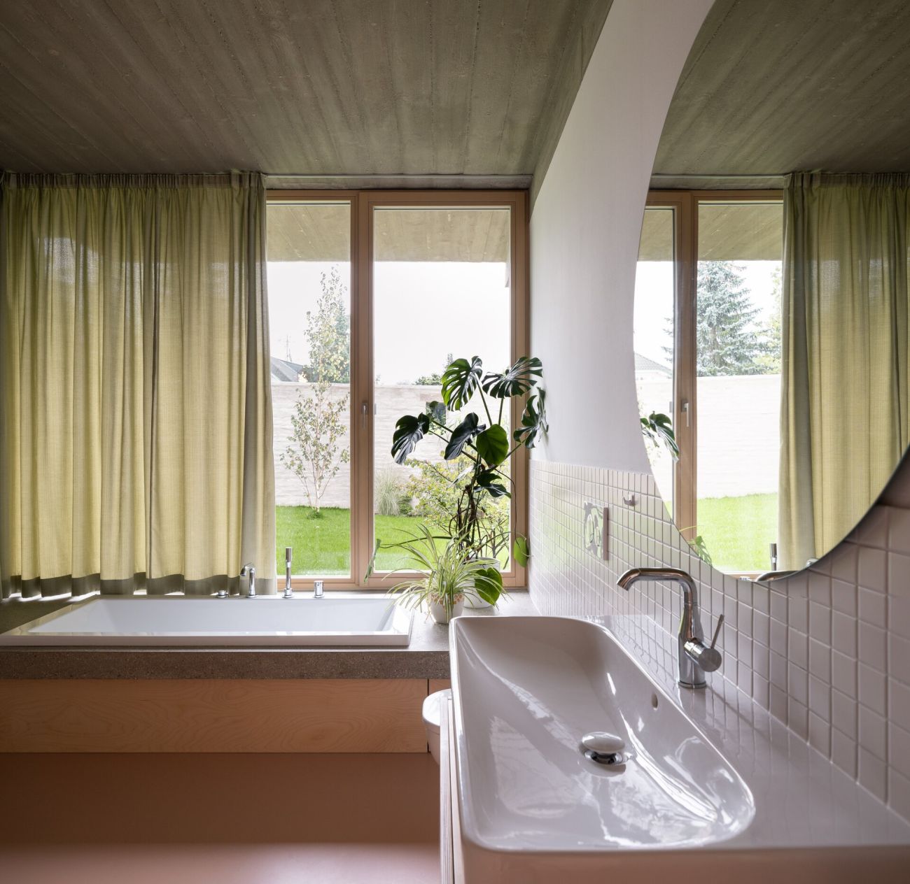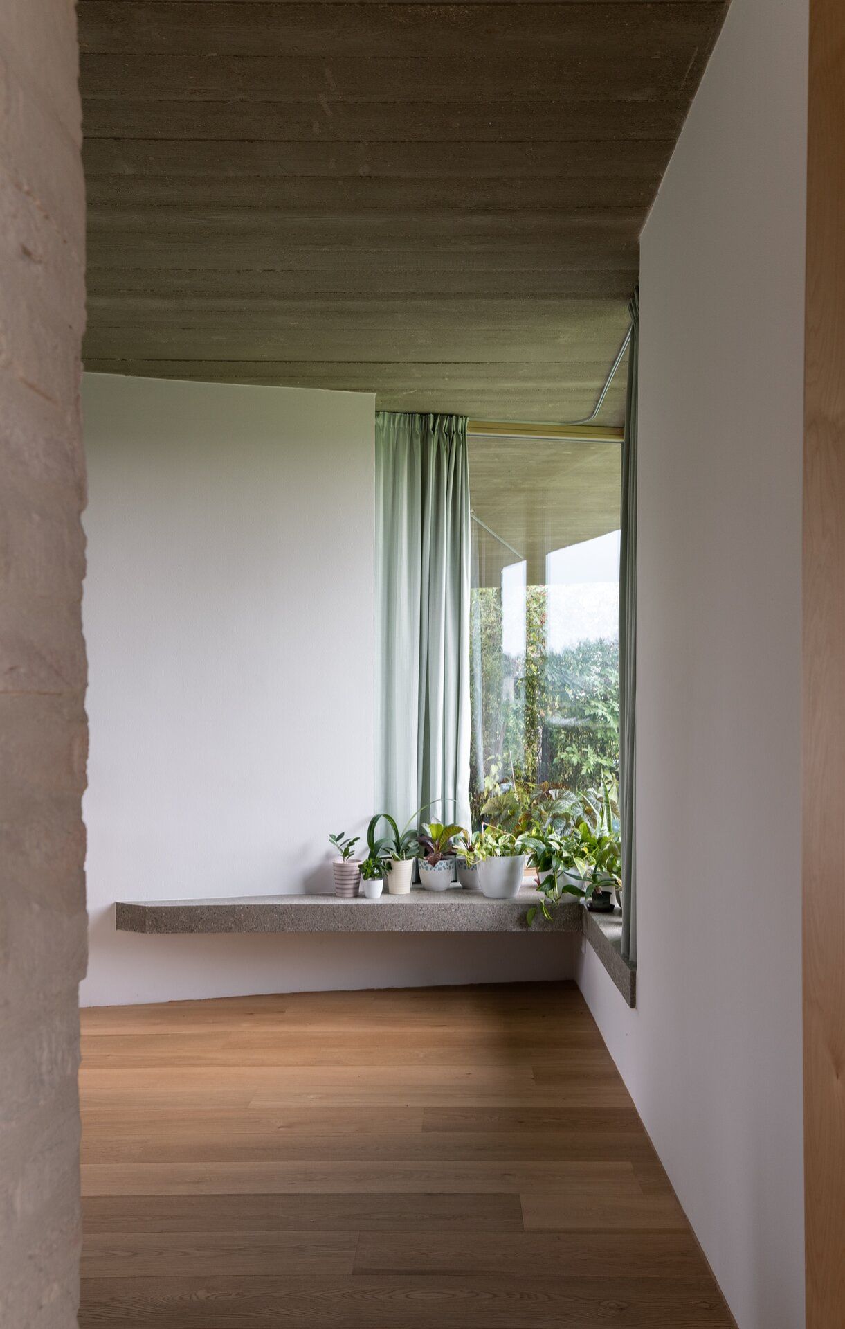 Ve stavbě jsou použity přírodní materiály a tlumené barvy v kontrastu s materiály v surové podobě. Betonové stropy, překlady a parapety jsou v pokojích vyváženy jasanovými příčkami, dubovou nebo sametově růžovou litou podlahou a jemně zelenými závěsy. Ze zahrady můžeme vidět beton, vápnem zatřené cihly z původního zbouraného domu, béžové dřevěné rámy oken, polykarbonát i ocelové sloupy.