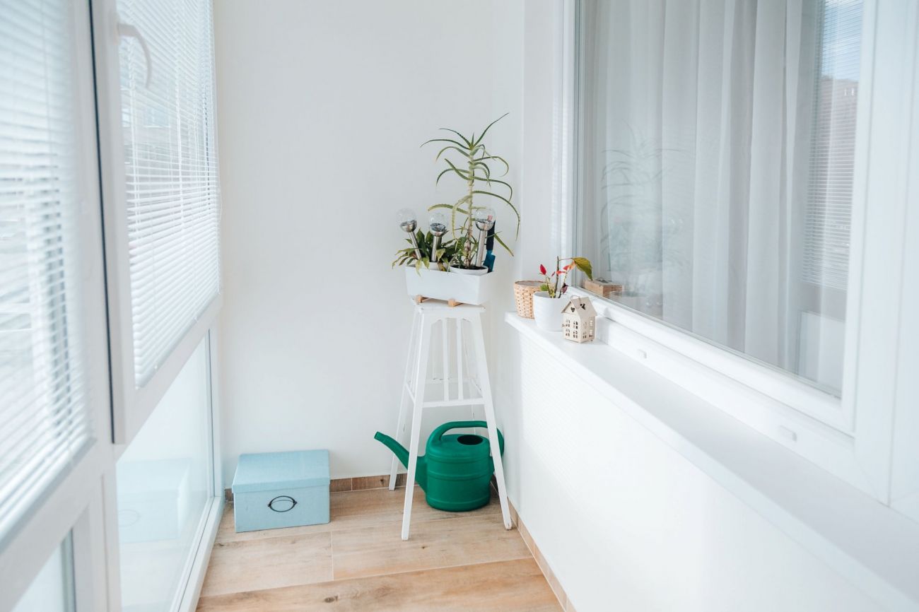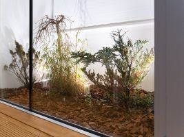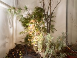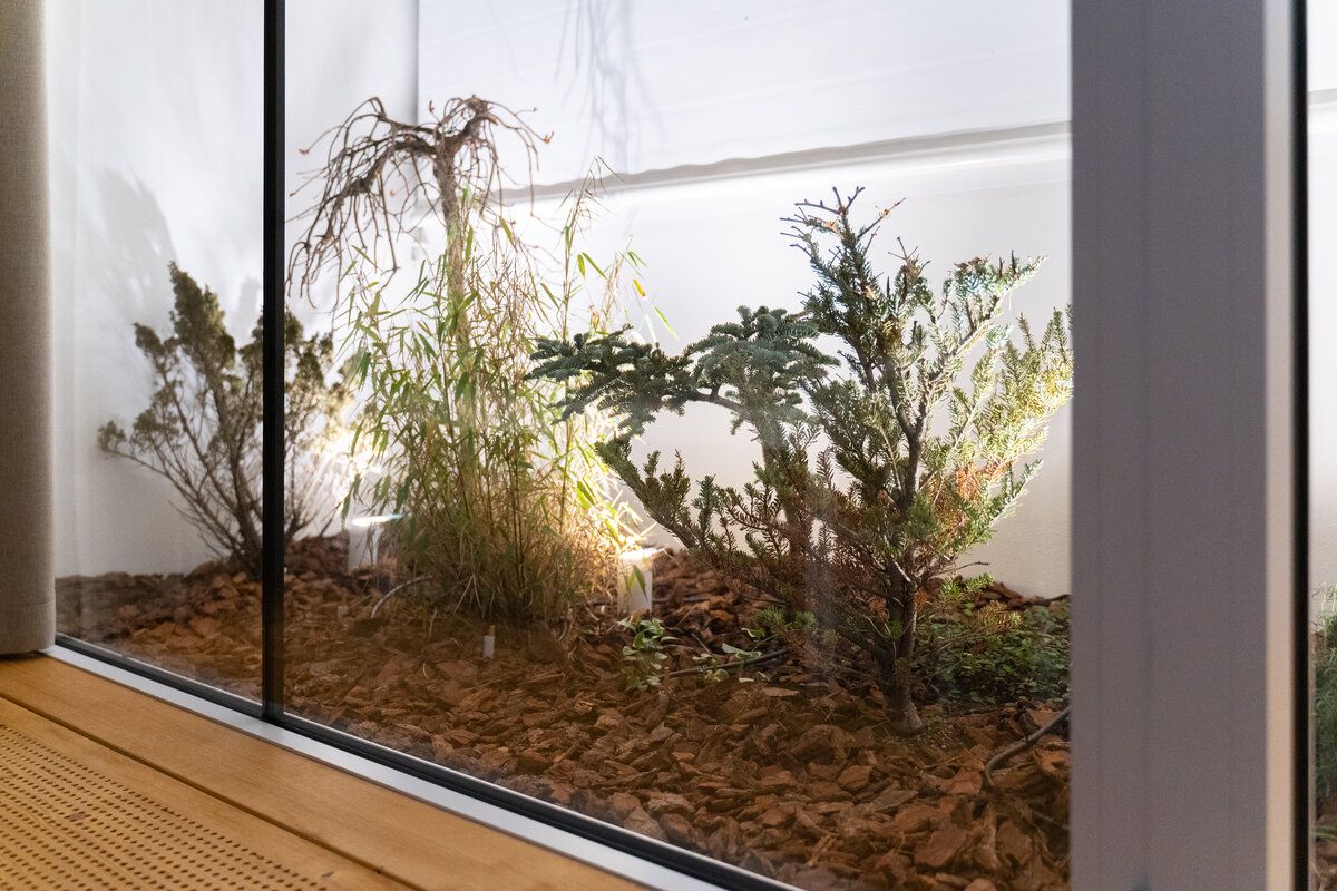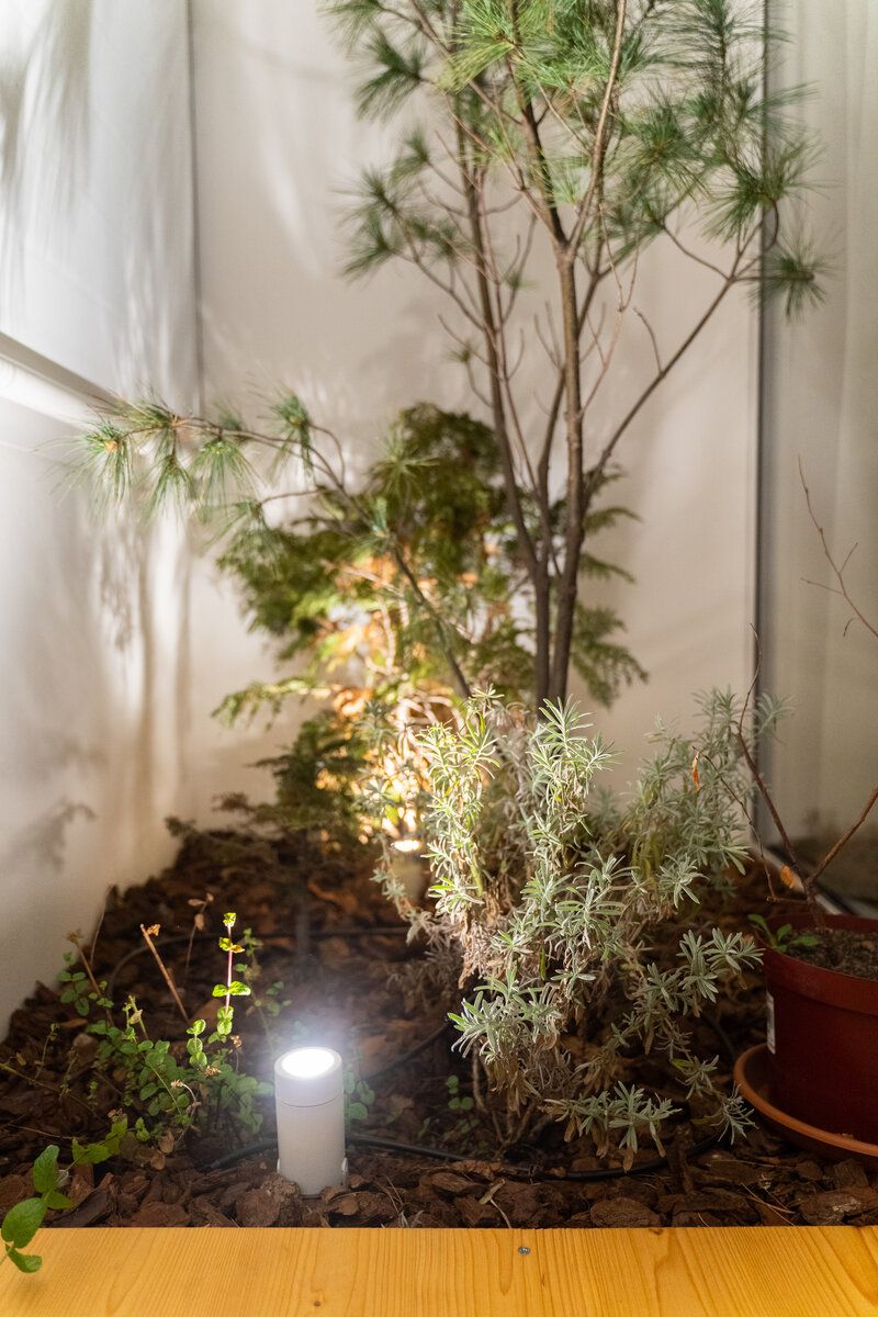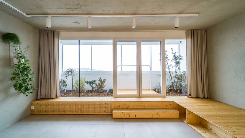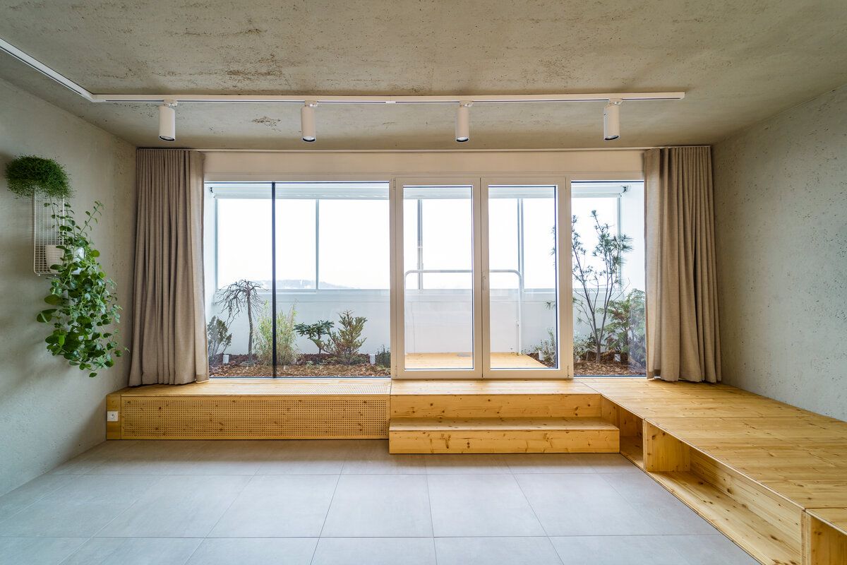 Zimní zahrada byla vytvořena instalací balkonového okna po celé délce zdi. Seřezaný panel vytvořil parapet a mezi balkonem a interiérem byla realizována skleněná stěna. Zahrada je přístupná z vyvýšené platformy, která plynule přechází z balkónu do bytu a zároveň díky své variabilitě slouží jako úložné prostory. Balkonové dveře je možné zcela otevřít a propojit tak prostor se zimní zahradou.