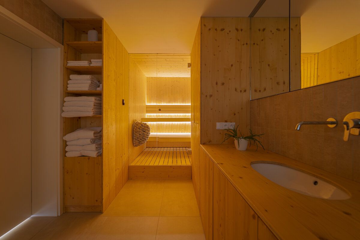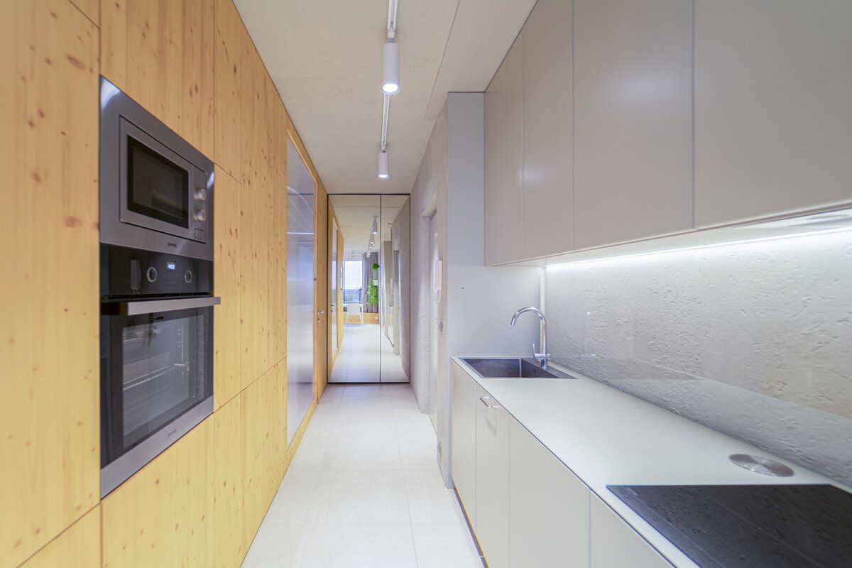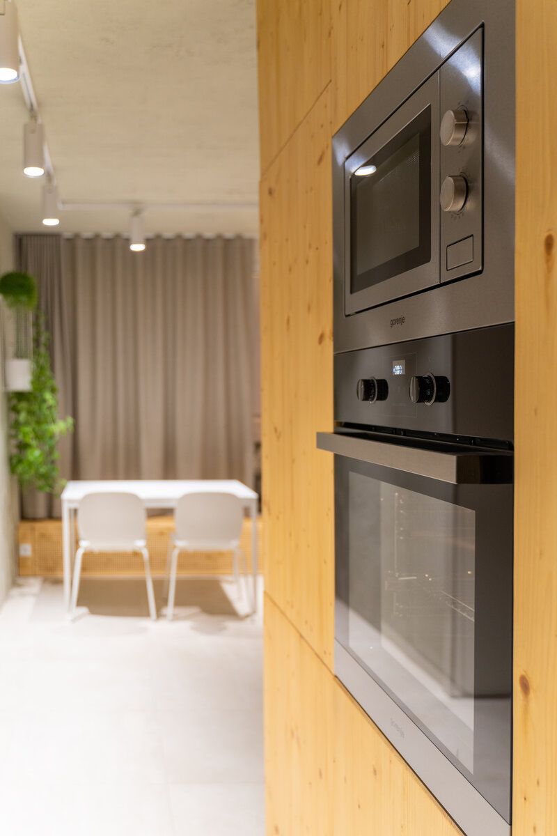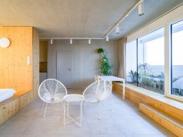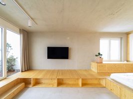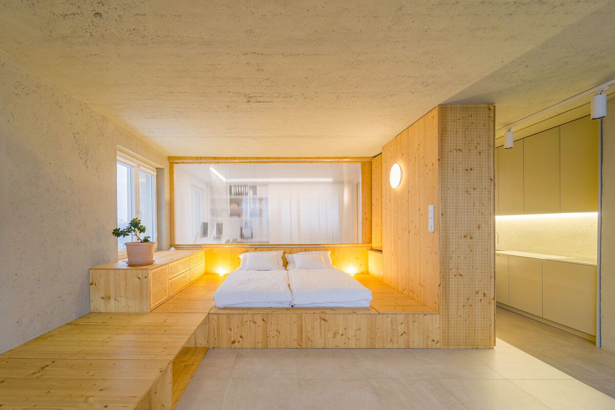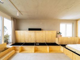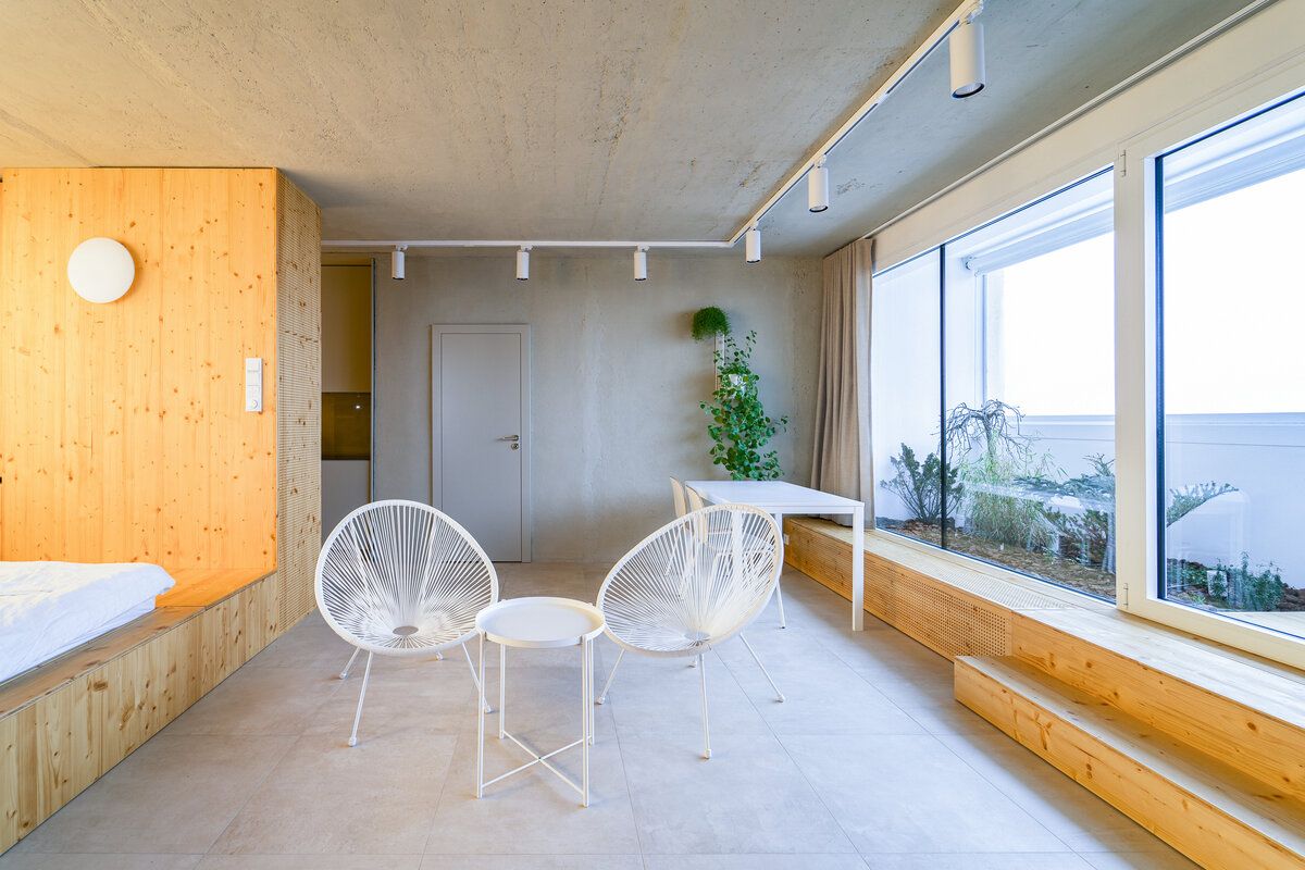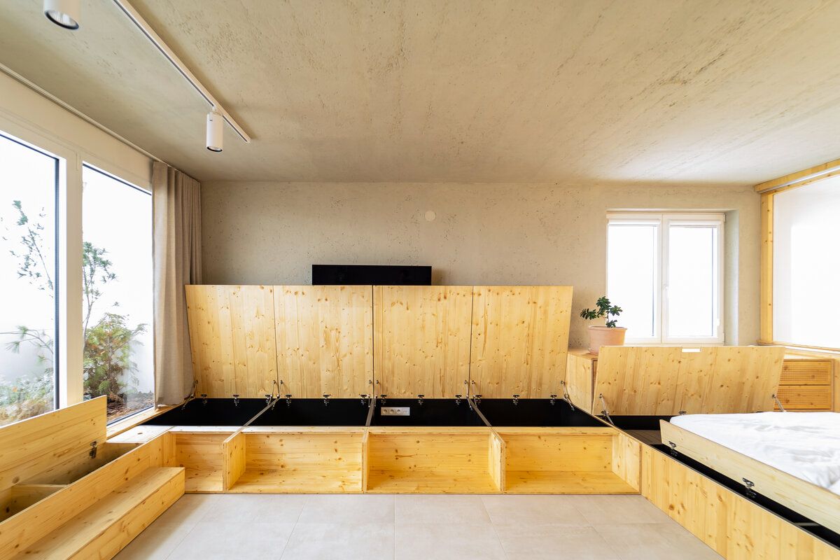 Betonové panely byly očištěny od původní omítky a následně natřeny jednotícím nátěrem. Hrubý beton je doplněn vestavbami z kartáčovaných smrkových biodesek.