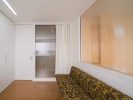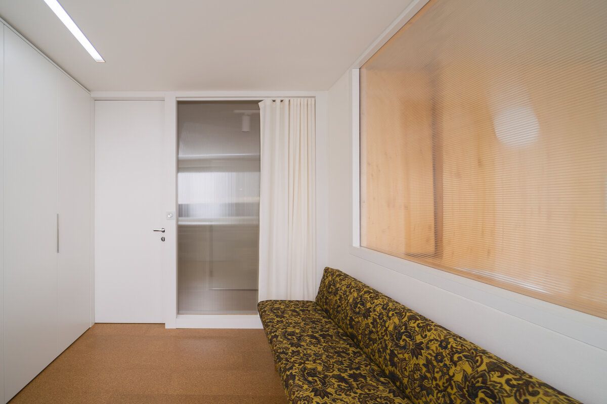 Byt, který obývá mladý pár, se stal po rekonstrukci velkorysým a propojeným prostorem pro trávení volného času i pro práci. Centrálním prostorem je obývací pokoj, který funguje zároveň jako ložnice. Původní kuchyně byla propojena s koupelnou, která se proměnila spíše na domácí wellness s finskou saunou, vanou a sprchovacím koutem. V bytě je také samostatná pracovna, kterou od společných prostor odděluje polykarbonátová stěna. Velmi zajímavým řešením jsou okenice, které po uzavření pracovnu opticky oddělí od ostatních prostor.