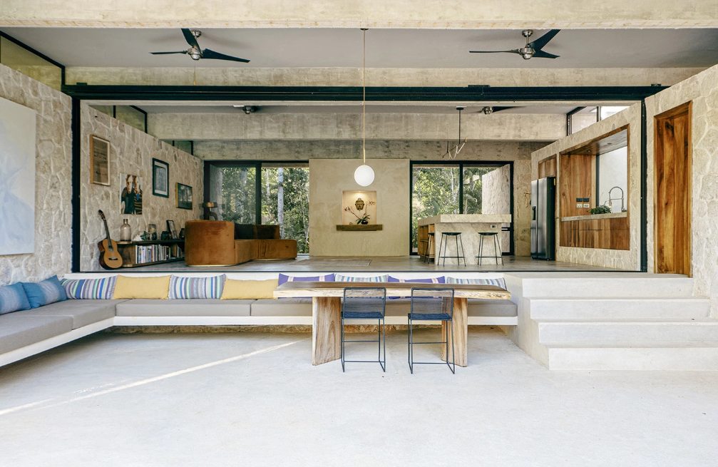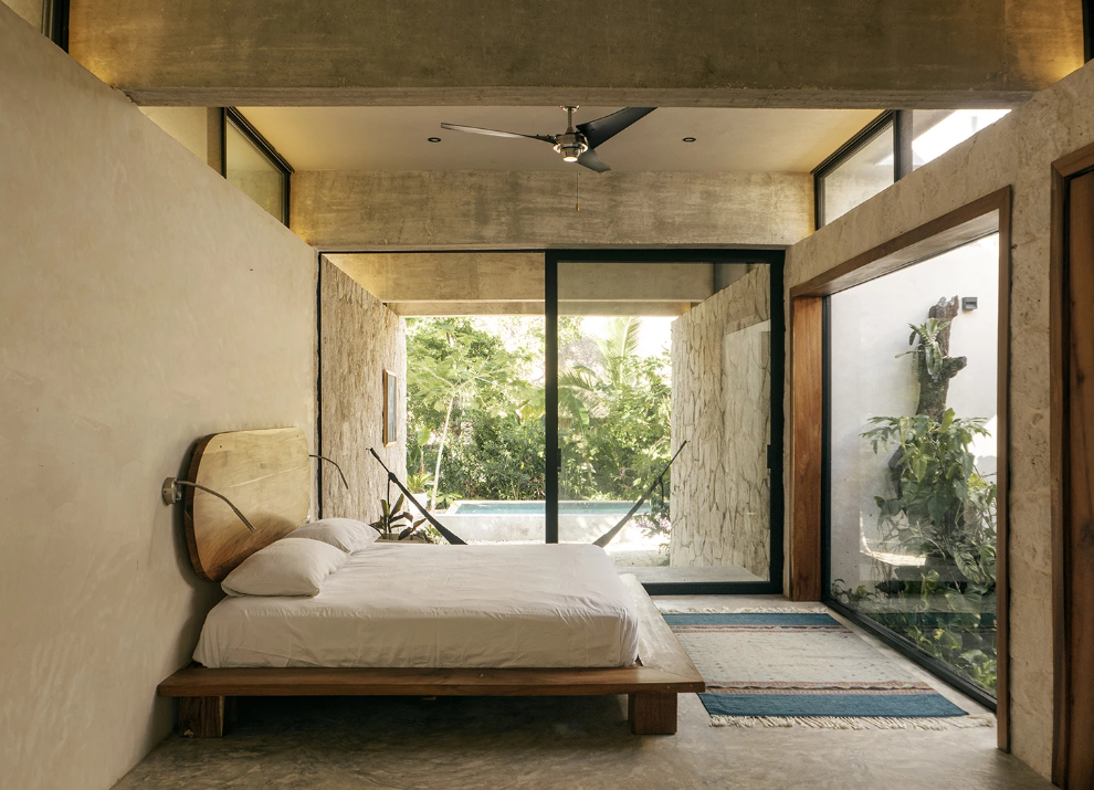 Konstrukce podlahy je pomocí nosných stěn zvednuta nad úrovní stávajícího terénu tak, aby umožnila přirozenou ventilaci pod domem. Stejný princip je použit i při konstrukci střechy, která je položena na pěti mohutných betonových trámech. Prostor mezi trámy umožňuje kontrolované provětrávání. Kromě tohoto opatření bylo třeba zajistit i dostatek stínu v interiéru, neboť místo je extrémně slunné. Bylo potřeba vytvořit stinné pobytové plochy uvnitř i v exteriéru. Na straně karibské zahrady je vytvořena velká překrytá terasa, jinak také exteriérová obývací místnost, která rozlohou tvoří přibližně třetinu domu. V nepříznivém počasí je možné ji zavřít skelnými posuvnými stěnami, a přičlenit ji tak k interiéru. Skelné posuvné stěny lemují i interiér, a to ze dvou hlavních stran, nahradily přední i zadní fasádu. Celý prostor je díky tomuto řešení variabilní a mezi interiérem a exteriérem se ztrácejí hranice. Vila byla navrhována s maximálním ohledem k místu. Pro komfort majitelů pak slouží bazén umístěný ve středu karibské zahrady a také věž, která je významnou součástí samotné architektury. Ve věži totiž najdeme jógovnu a výhled na mexické lesy.