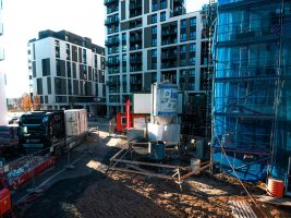 Hotový celek byl na staveništi osazen pomocí jeřábu až do 15. patra budovy.