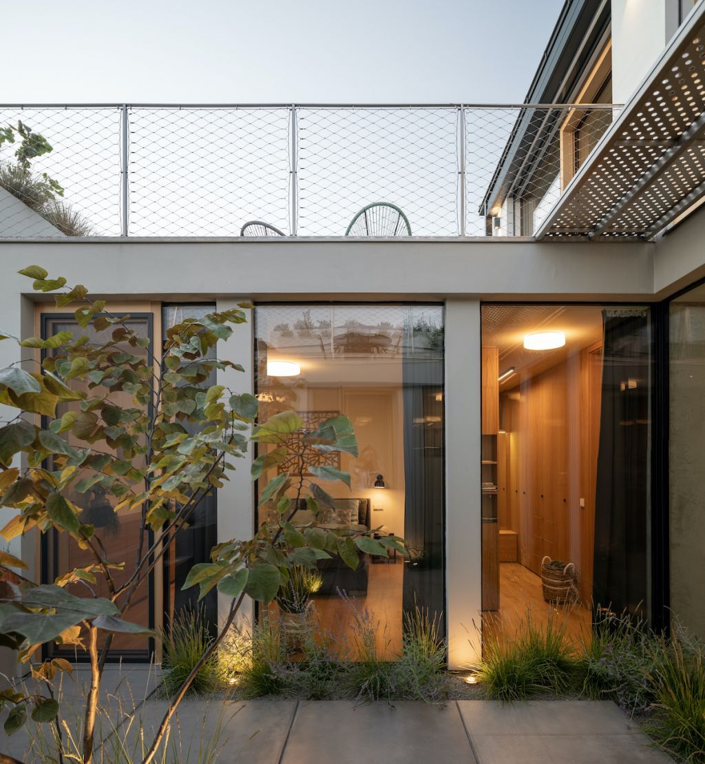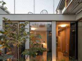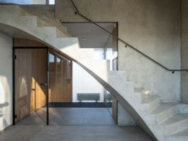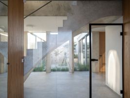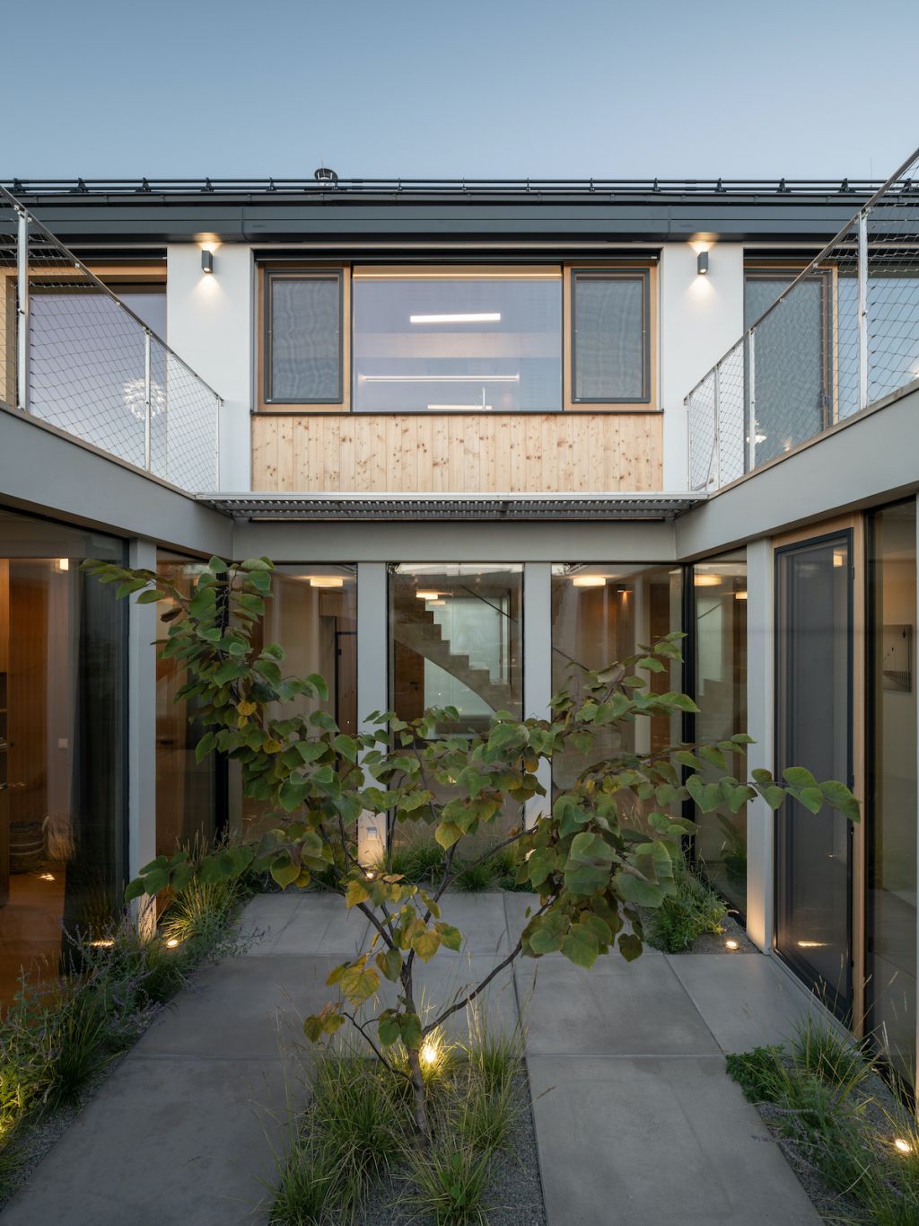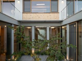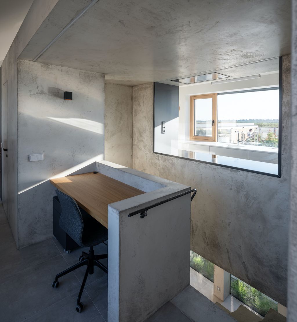 Rodinný dům na malém svažitém pozemku nabízí unikátní pohled na Pálavu. Cílem studia SENAA architekti bylo vytvořit současné moderní bydlení na vesnici, které bude zapadat do zástavby sousedních katalogových domů. Celkové řešení je založeno na propojení domu a zahrady. Svažitost terénu proto využili architekti k polozapuštění atria a vytvořili tak pohodlný výstup z přízemí i podkroví do zahradní části domu. Zajímavým řešením je také rozšíření interiéru do zahrady. Samotné atrium se pak stává srdcem celého domu, a především architektonicky velmi zajímavým prvkem, který bychom u rodinného domku nečekali. Velmi unikátní je průhledová osa z interiéru do vnitřního atria, která stavbě dodává výjimečnost. Neobvyklým řešením pro rodinný dům je také tmavě šedá omítka s hrubším zrnem a výraznější texturou ve spodní části domu, horní patro má naopak jemnější světlou, přírodní omítku. Dominantou je neobvyklé sochařsky pojaté schodiště, vedoucí z haly do horní obytné části.