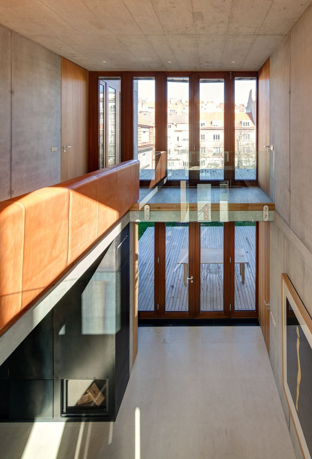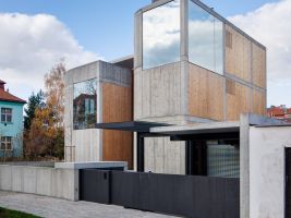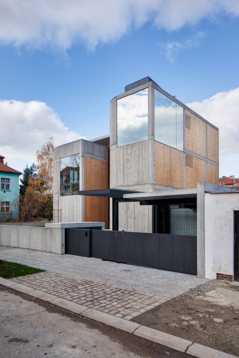 Dům vyrostl ve čtvrti prvorepublikových domů v Procházkově ulici v pražském Podolí. Pochází z dílny architekta Josefa Pleskota a atelieru AP a upoutá použitím tzv. pohledového betonu. Specifické jsou také zrcadlící se stěny. Použitým materiálem je pohledový beton, o kterém sám architekt tvrdí, že je materiálem tohoto století. Dům má monolitickou betonovou konstrukci, na které je v interiéru vidět šířka litých stěn. Konstrukce je zvenku zateplena polystyrenem, ve kterém jsou umístěny nerezové kotvy, na nichž je zavěšená 12 cm široká betonová fasáda. Vilu tvoří tři nadzemní a jedno podzemní podlaží. Parkovací stání se nacházejí na úrovni terénu v přízemí domu. V interiéru je využito mnoho přírodních materiálů, jako dubové dřevo, sklo, surová hovězí kůže a ocel, vše především z české produkce. Veškeré použité materiály mají ryzí přírodní podobu. Dům je díky své dispozici velmi vzdušný, prosvětlený a prostorný, a to i díky velkým plochám celistvých zrcadlových skel, což ho odlišuje od ostatních staveb. Vnitřní prostor je otevřený přes dvě patra, takže čtyřčlenná rodina s malými dětmi, která ho obývá může spolu celý den komunikovat.