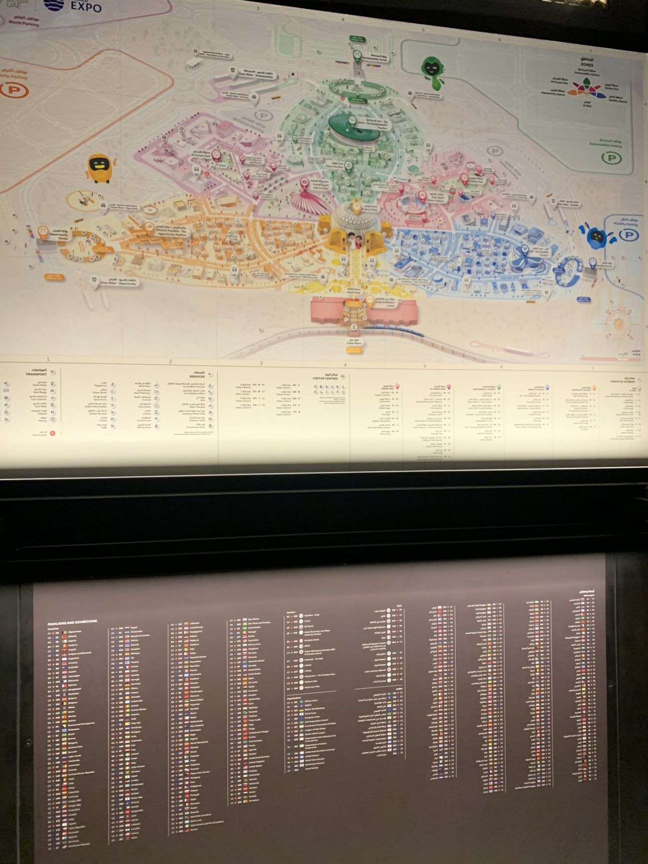 Až do místa dorazíte, rozhodně si obstarejte mapku, bez které se jinak v areálu, který má dvojitou rozlohu Monaka, ztratíte. Areál je strukturovaný do pěti kategorií zaměřených dle témat. Společné mají to, že souvisejí s udržitelností. Součástí rozlehlého areálu je také odpočinková zóna, parky Al Forsan a Jubilee Park. Pokud chcete mít o celém dění přehled, rozhodně byste neměli minout vyhlídkovou věž z které je vidět na celý areál.