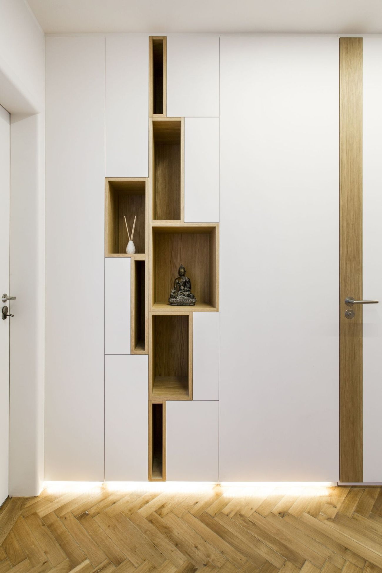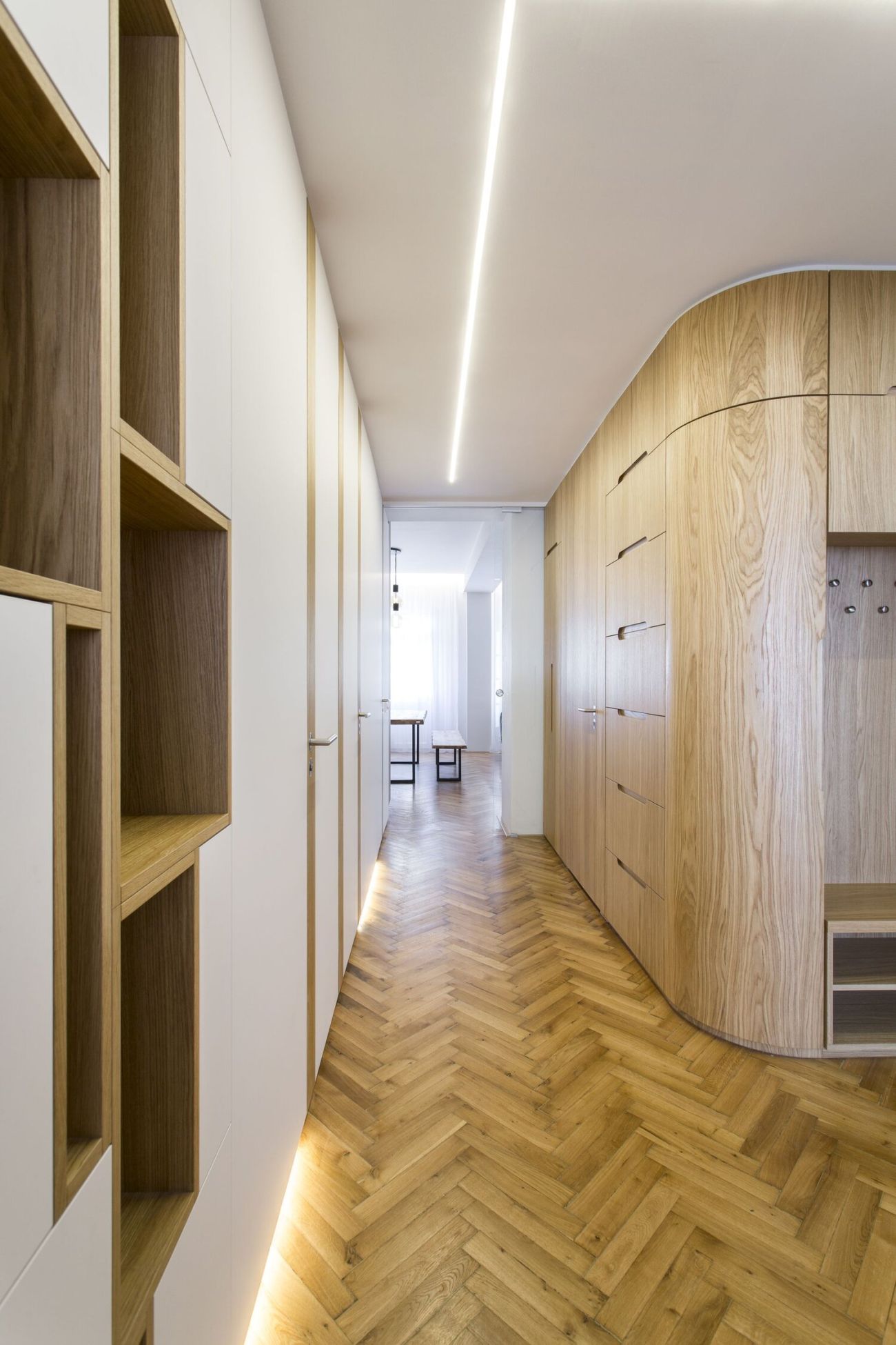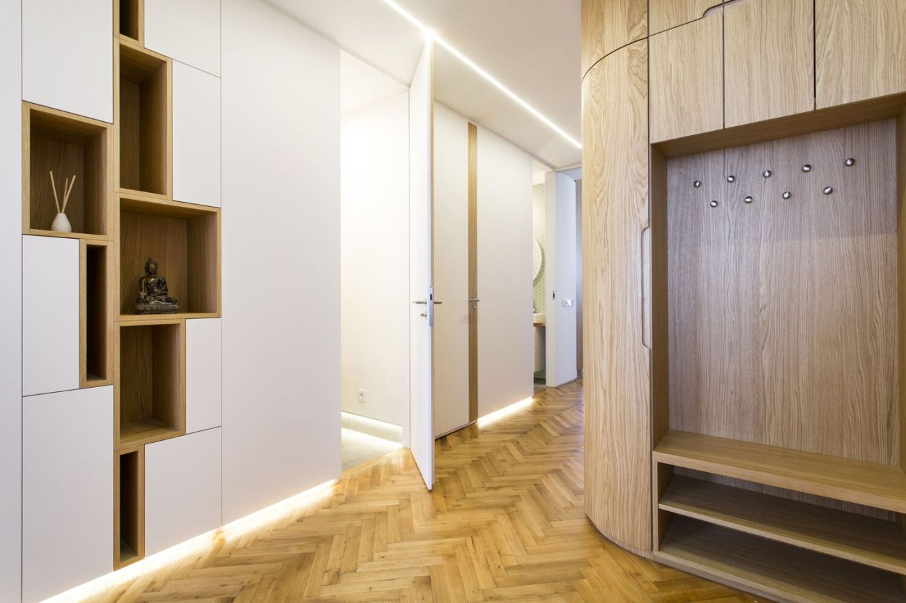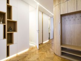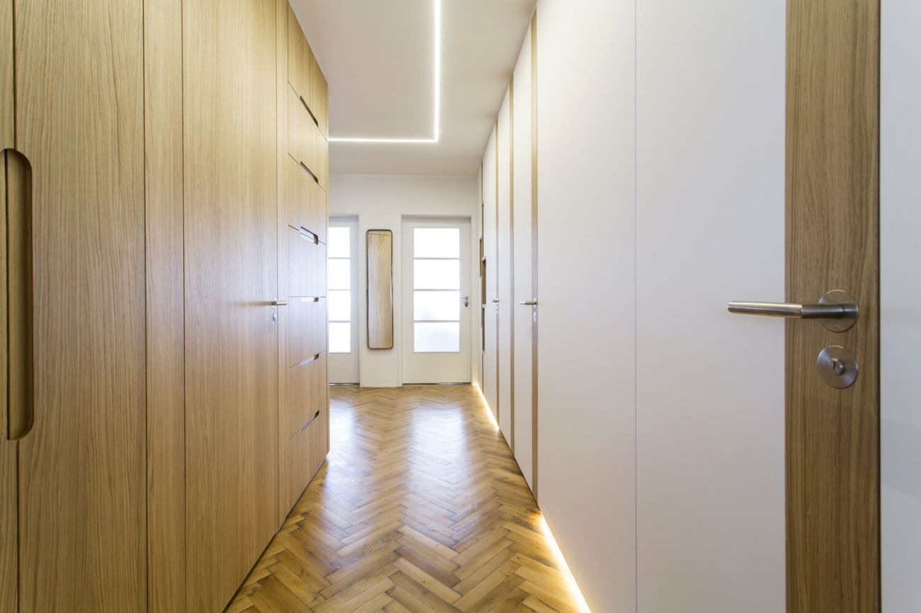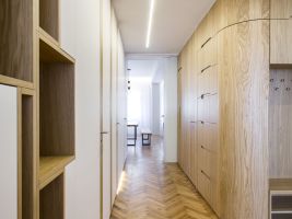 Nové dispoziční uspořádání vytvořilo velkorysý a reprezentativní centrální prostor bytu, který tvoří kuchyně propojená s obývacím pokojem. Stejně tak z chodby vznikla díky změně dispozic celistvá místnost s dostatkem úložného prostoru. „Vše působí jemně a kompaktně, majitelé si přáli navýšit úložnou kapacitu o šatnu, což se nám podařilo elegantně vyřešit díky oblouku v chodbě,“ dodává Šimon Vojtík.