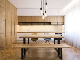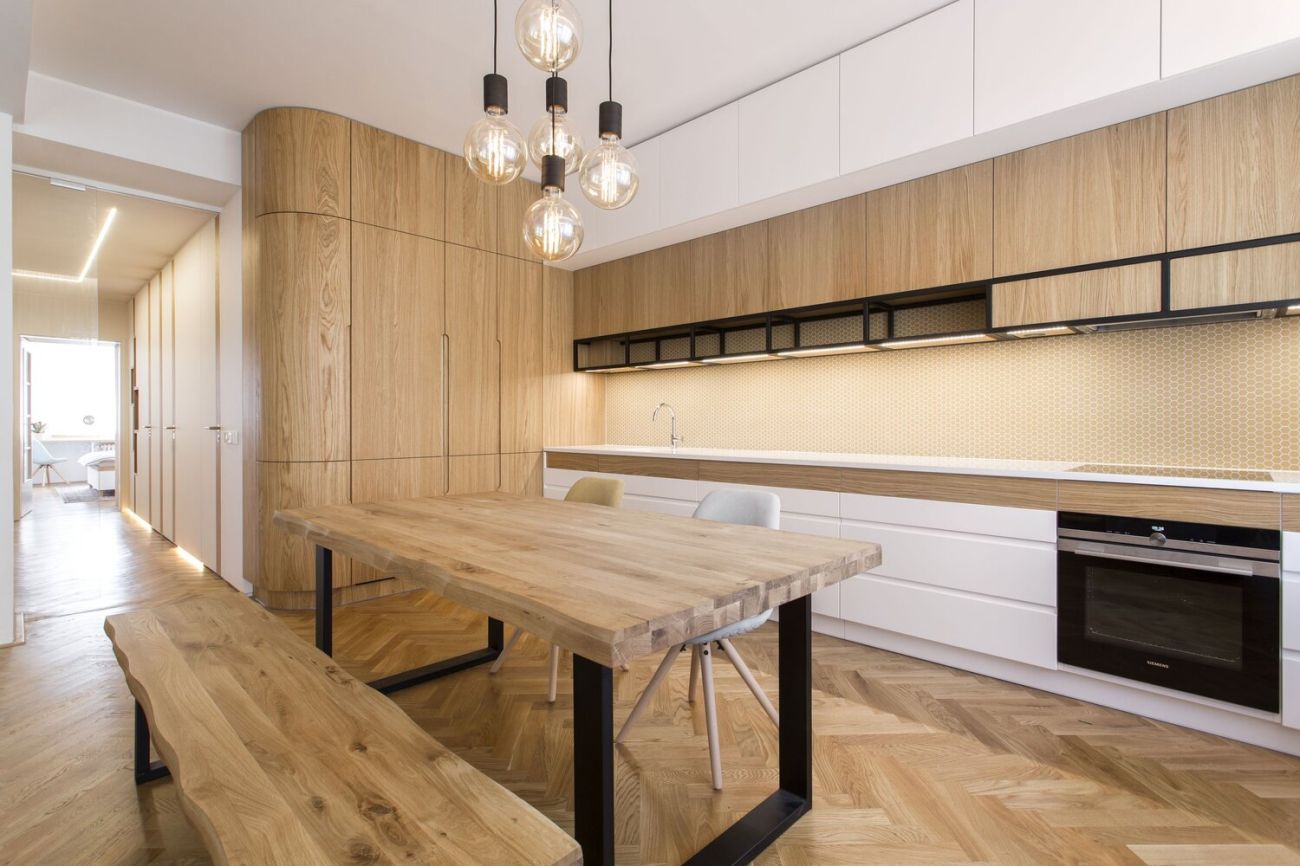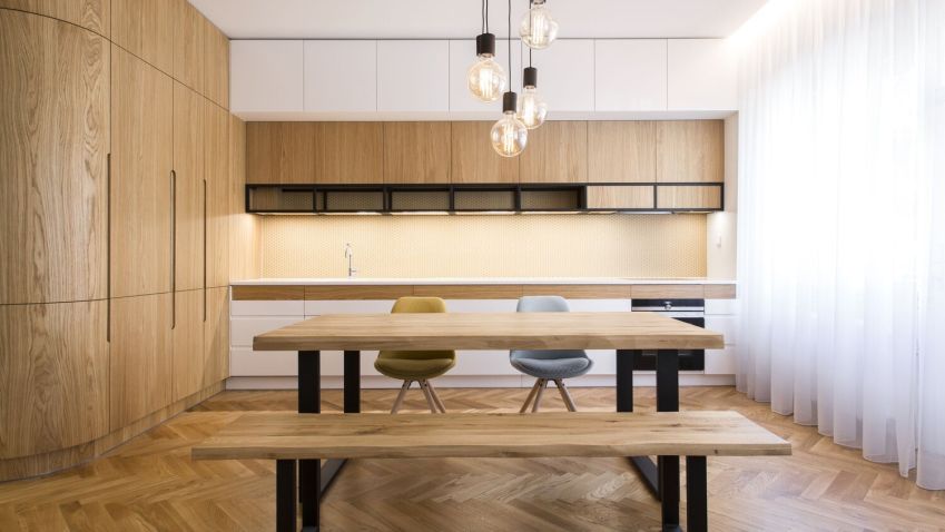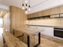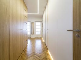 Zajímavý interiér tvořený především z přírodních materiálů najdeme v pražském Karlíně. Nachází se ve starém činžovním domě z 30. let. Architekti z atelieru ARCHUM zde pracovali především s dřevem a jemnými barvami. Vytvořili moderní udržitelný prostor při zachování některých původních detailů.